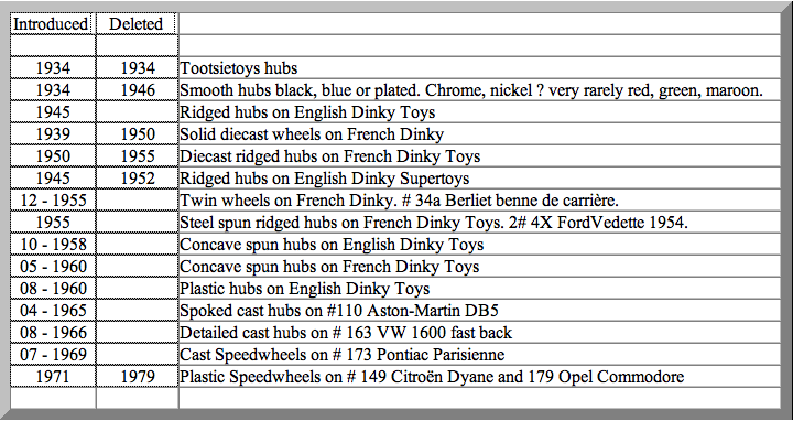 Hello Jacques, For your list of smooth hubs I have some additions on the pre war British. Not only black color is know but also, very standard, blue. Extreme rare are some other colors, red, green, maroon. These colors were only fitted for a very short time and matched the color of the models, no's 24 and 25. See also recent article in The Journal on these models. The labels of pre war boxes 24, 25, 33, showed the models with these extreme rare hubs. In 1945/1946 the hubs on most models still were smooth, soon replaced by the ridged types. John.