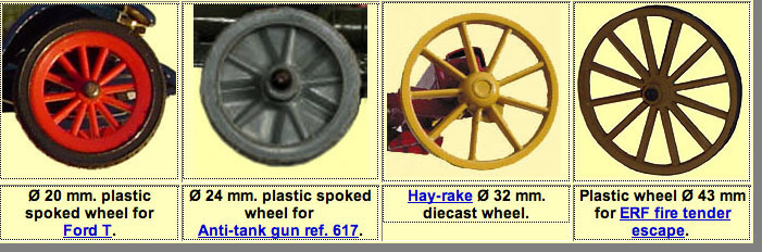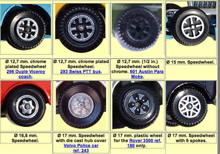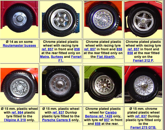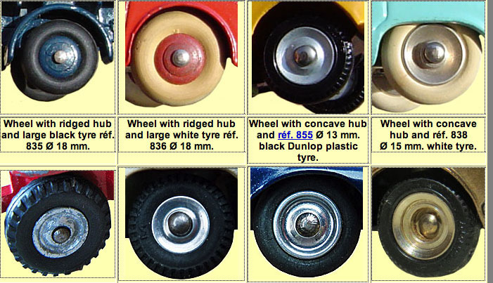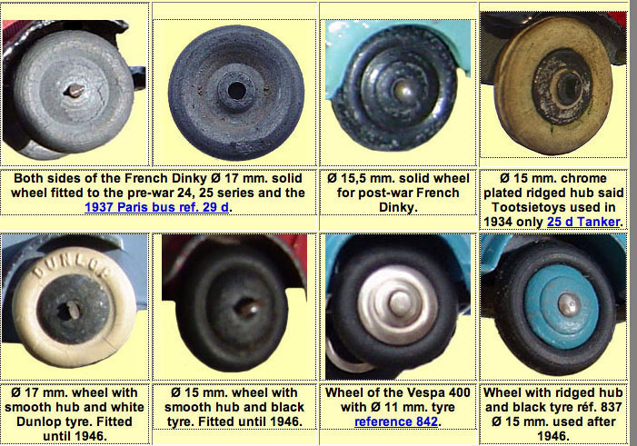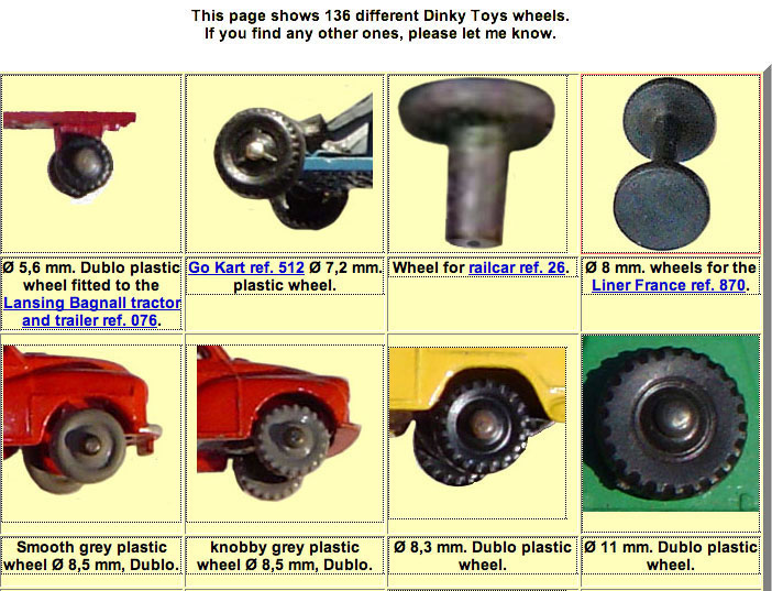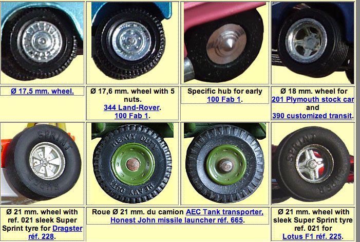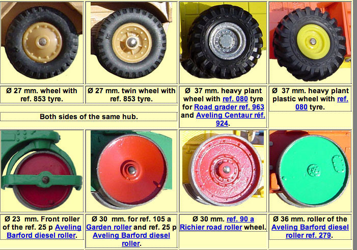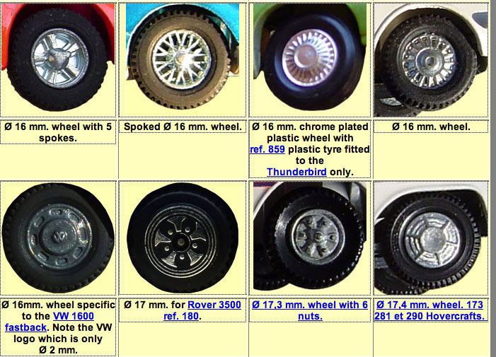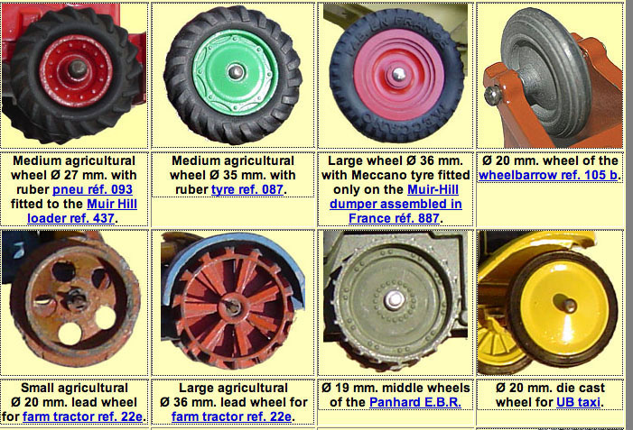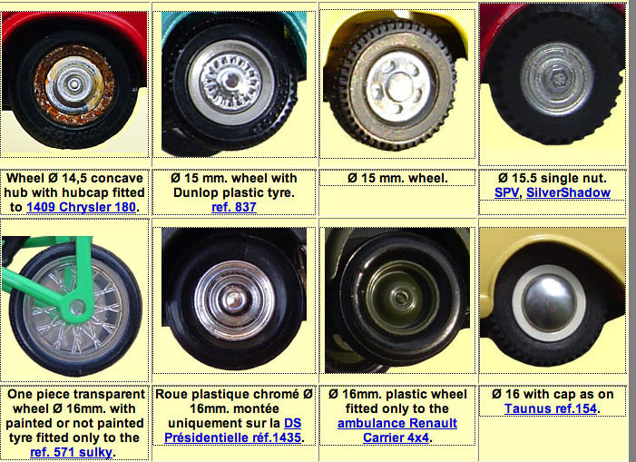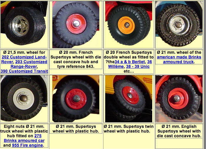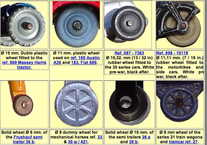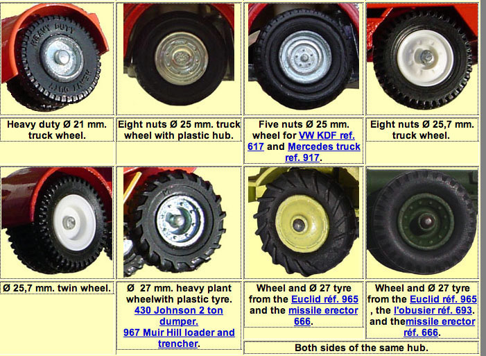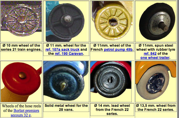Dear Jan, There are no stupid questions. The aeroplane wheels are not part of this list because I do not have any. If someone wants to provide the material : pictures and data, I would include them. Aircraft wheels probably come in several diameter and thickness but I think that they are all the same (are they John ?) made of spun steel except the wheels of the Arc en Ciel which are the same as those of the little trains and the mobile petrol pump 49b. The dia. 6 mm. support wheels for the Fruehauf semi-trailer may well be the same as those of the Caravelle or Super G but I can not check this. The liner France did have wheels but the other ships and some railcars had rollers. We can argue about rollers being wheels or not. After a staff meeting with me and myself, we have decided that they were not but nothing lasts for ever and this could be changed under sufficient pressure. All the best. Jacques.