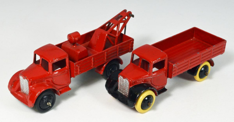 I looked, and did not see this topic listed, so thought it might be fun to try it here. Jan Werner and I have seen this topic used to good effect on the Planet Diecast forum, and I am hoping it will prove interesting and fun here as well. There are so many possible pairings or interesting and unusual combinations of Dinky Toys, that it should be easy to come up with many examples. I also hope this helps stimulate more discussion and participation on our website. So here is my first effort.....and a nice one to start with. It is the pairing of the 22c Motor Truck and the 30e Breakdown Car (truck really). Both of these models were originally made pre-war, then re-introduced for a few years after WWII. They share the same casting, with the difference being the towing crane added to the Breakdown Car. Many have tried to assign a prototype vehicle as being the inspiration, but it was finally decided that this is a mix of real truck designs, with both Bedford and Dodge influence. My Motor Truck is an interesting, very early post war edition, as it has pre-war style smooth black, shiny wheels, the open rear window, white tires, and also black painted wings or fenders. There was also a Searchlight Truck version, which is quite rare and hard to find. These are really neat little trucks, so enjoy! Regards, Terry