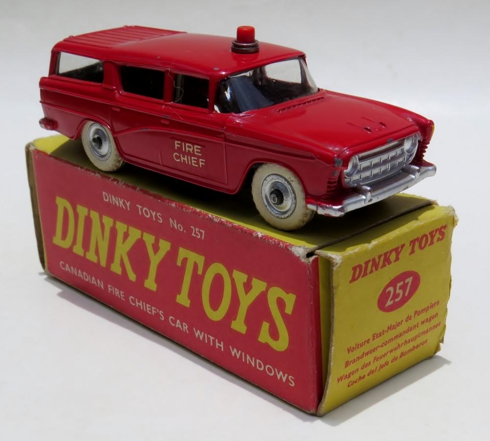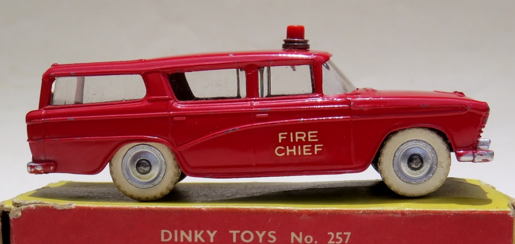 Richard Yes, you have all the combinations - except for one additional 257 Canadian Fire Chief's Car! Here it is: Normal casting except for its wheels. Cast silver, identical to that used for the Porsche in red and AC Aceca in brown and cream, 405 Universal Jeep plus the 259 Fire Engine. Most 257 with cast silver hubs that have been sighted in recent years have been shod with white tyres. Bruce