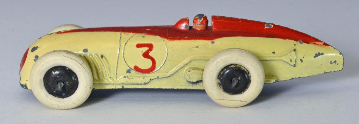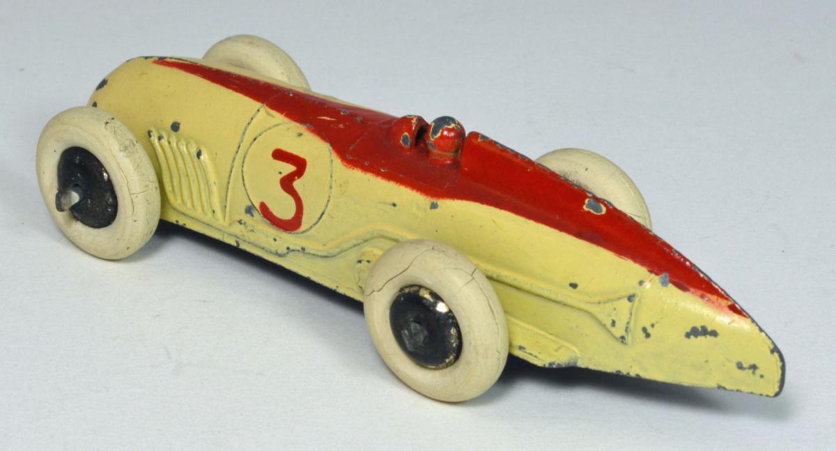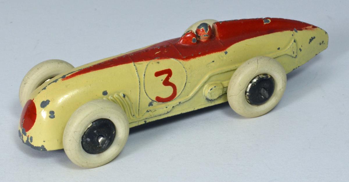Walter--Sorry that I cannot be of much help on this one....I only have one pre-war Dinky race car, the 23. Not sure exactly what year it was made, but it does have the two number roundels, with only the left side actually stamped with a numeral. It has crimped axles all around. Perhaps others can add theirs as well. Regards, Terry