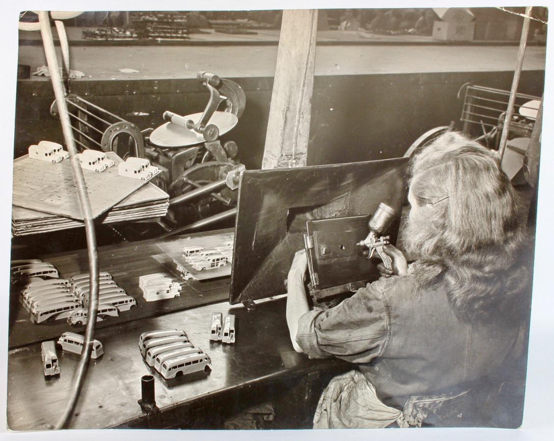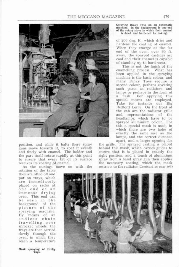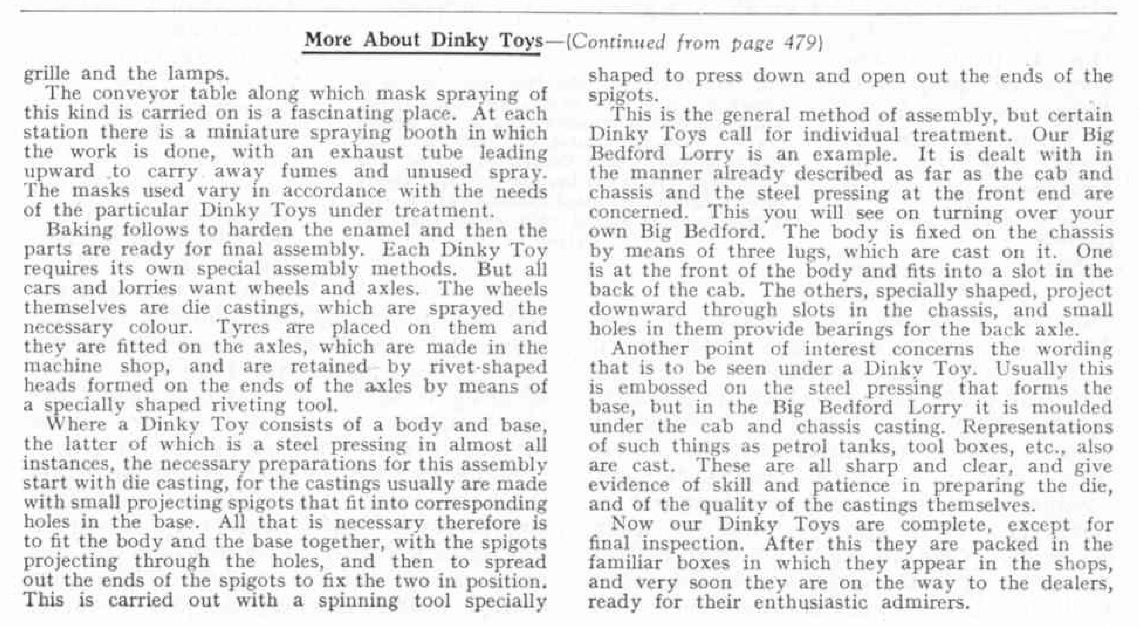 Incomprehensibly little information can be found about the mask spraying, while there is hardly any Dinky Toys model on which the mask spraying was not applied to embellish the model. A lot of information has been written about the technical production of Dinky Toys models, but almost nothing about the technique of mask spraying of the model. I'm trying to dig up some information and bring it here, so it doesn't get spread over all kinds of topics and can't be found anymore.There are pictures of the mask spraying, but there is often little explanation. Richardson says on page 260 of the GB of DT about mask spraying among others:Flashes, radiators, lamps etc are sprayed with hand guns through masks that cover all the part that is not to receive the second colour, in a booth with extraction to remove fumes and unused spray. And ... Problems occurred on masking for two toning when the color scheme had originally been intended to be single tone because of the absence of casting lines to assist the positioning of the spray mask. The soft brass or copper masks had to be fettled and titivated frequently. This led to variations in the color split, notably round the windscreen opening, eg. 175 Hillman Minx.He names the material of the mask as being made of brass or copper. That's information I haven't come across anywhere else. There may have been articles written about it that I am not familiar with.I found pictures of the mask spraying of the 29e Single Deck Bus on Vectis and 29c Double Decker Bus on Planetdiecast and DTCA that I show here and try to (let) explain. 2 different ways of mask spraying are shown. TMT website is unfortunately closed.Photo 1: In itself it is very interesting what can be seen in this photo. At the lady on the table, 29e Single Deck buses are waiting, apparently to receive the side flash. On the assembly line are Single Deck Buses that have already received a flash. There are also already processed 30h Daimler Ambulances and 27f Estate Cars. In the background is a rolling device. Does anyone know what it was used for?The lady is pointing the spray gun at an angle to the mask. As you can see there is an external bulge and shape lines in the mask, while there is a fairly small hole in that shape to the right. What would that bulge on the left be for? The mask with the bulge and hole is a loose small plate that is separately riveted to another plate.Immediately below the small mask, rivets are also visible to fasten anything. Given the shape of this small mask, it seems quite plausible to me that it is made of copper (as Richardson says). Shapes are easy to make in copper. But, how can a flash be sprayed all over the side of the bus through such a small hole without spraying the rest of the side with paint? It makes the most sense that the bus is pressed against the mask with the side, but what is the need for the bulge on the left? The bus has no bulge on the sides and the bus also needs to be turned over for the flash on the other side while the left and right front casting of the cabin are also different.For clarity I am adding photos of the Single Deck bus.This is what we see of the mask on the outside. Unfortunately I can't show a photo of how the mask for the 29e is prepared on the other side. Are there ideas how this could work here?Photo 2: The lady appears to be spraying the radiator grille and headlights of the Single Deck Bus. The nose of the bus appears to be pushed perpendicularly into the mask with the radiator grille and headlights and pressed down firmly to prevent overspray. The flash on the sides are already painted.Also visible are 27f Estate Cars on the assembly line that already are mask sprayed.Photo 3: Here the 2nd color of the 29c Double Decker Bus must be applied. Looks like the bus is held in a open containerclamped with a kind of pliers handle. The container covers the part of the bus that is not allowed to receive a 2nd color. Looks like the bus goes upside down in the container and the bottom part gets a 2nd color. For clarity I am adding photos of the Double Deck bus.Finally, I add the last part of an October 1954 article in Meccano Magazine entitled: More about Dinky Toys. From Casting to Packing,in which the mask spraying is discussed and depicted.In the photo of the mask spraying, I also see ladies with and without a mouth mask.I quote from it an important passage about mask spraying:'This is not the finish of the enamelling process. What has been applied in the spraying machine is the basic colour, and many Dinky Toys require a second colour, perhaps covering such parts as radiators and lamps or perhaps in the form of a flash. For applying this special means are employed. Take for instance our Big Bedford Lorry. On the front of the cab are the radiator grille and representations of the headlamps, which have to be sprayed alluminium colour. For this a special mask is used, in which there are two holes of exactly the same size as the lamps, and the correct distance apart, and a larger opening for the grille. The sprayed casting is placed behind this mask, which carries guides to ensure that it is placed in exactly the right position, and a touch of alluminium spray from a hand spray gun then applies the necessary coating, which the mask restricts to the radiator grille and the lamps.The conveyer table along which mask spraying of this kind is carried on is a fascinating place. At each station there is a miniature spraying booth in which the work is done, with an exhaust tube leading upward to carry away fumes and unused spray. The masks used vary in accordance with the needs of the particular Dinky Toys under treatment.' Comments, improvements or additions are welcome.It would be very nice if more photos are added.One thing is certain for me. I am gaining more and more respect for the ladies who did this meticulous work, which we can still enjoy after so many years. Jan Oldenhuis, 25 June 2021