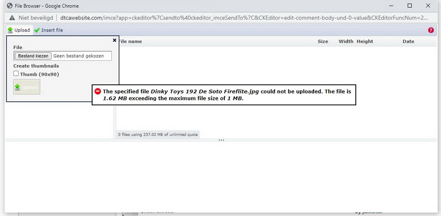 Example website information when try to upload a too big file. You do that as follows: 1*) Click the cursor on the place you want to place the photo in your forum contribution 2*) Click on the box image at the top of the forum text writer (when you place the cursor on a box you will see the meaning of the box). 3*) Click on Browse Server. 4*) Click on Upload at the top left. 5*) Click on Choose file. 6*) Find the folder with photos on your PC and click on the photo you want to upload and then click Open. 7*) Click on Upload at the bottom left and you will see the photo appear in the text writer 8*) Click on Insert File at the top right and you will see the photo uploaded in the frame of the text writer. On the left side of the frame you can now adjust the width of the photo if necessary. (I doubt if that is good working. I always resize the photos to a width of 700 pixels in my own photo programso I know for sure that the photos come nicely under each other in a straight line and will be visible in full width on a PC, laptop or Ipad screen.) 9*) Click on OK at the bottom left and the photo is now placed below the text in your contribution. 10*) Then press Enter and the cursor appear under the left side of the uploaded picture. Now you can complete the entire contribution in this way with text and pictures as you wanted.You can enlarge the working screen of the text writer by dragging down thebottom right corner of the screen with the mouse, which enlarges the working screen. Note: if you click on an uploaded image with the mouse, it will turn blue and if you than accidentally press Enter, the photo will disappear and you will have to upload the photo again.To avoid this clickwith the cursor of your mouse outside the image and it wil return to normal. It is cumbersome, but gradually it gets better and better. Take your time. Do not work under time pressure. Good luck. I hope you will succeed and I hope I get members excited to also post text with photos in their contribution.You can print out this manual for ease of use. Note:All contributions can always be viewed in full width on an iPad or smartphone when the screen is rotated in portrait instead of landscape. Best wishes, Jan Oldenhuis, 23 January 2022