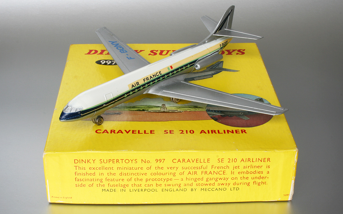 A very happy collecting milestone, this Liverpool-made no. 997 S.E. 210 Caravelle, to complete the Franco-British counterparts couple. I believe it will be wishful thinking to hope ever finding (and being able to afford) the rare SAS, Swissair and Air Algrie versions in fine condition. This example of the British one is really exceptional in quality, both box and model so near to mint, whereas I only paid less than half the average price habitual for even a slightly less quality model. My patiently waiting for this unique chance to come along has been rewarded at last ... Kind regards, Jan