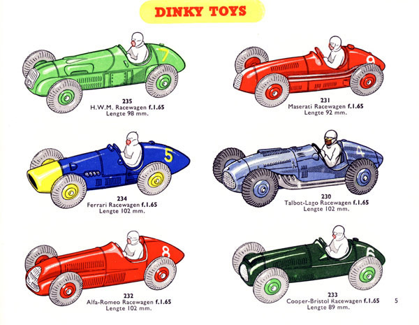 In my opinion Meccano was always necessarily a bit ambivalent in their attitude towards the real world and the toy world, a difficult choice indeed. Have a look at those painstakingly made mock-ups and design drawings on accurate scales, made by professional designers, drawers and engineers on the one hand, and the proudness of their 'gay colour schemes' for the toys on the other hand. As models of the real world cars most of them were reflected very accurately - that is, if that was economically feasible. As toys, however, Meccano could not afford to have six red racers - so stopped at the number of two - or more than three models in British racing green. The Connaught and Jaguar got other shades of green because of that. Unrealistic, but nice as toys. The green Cooper-Bristol even got red wheels lateron in order to have a less 'dull' appearance. The green itself was also made a little brighter.