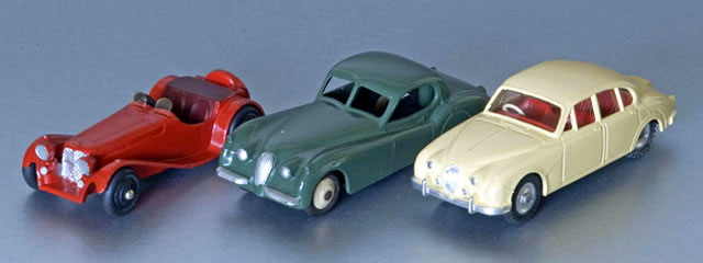 Dave--Nice trio of Jags for sure. When I was growing up, my dad bought a brand new 2.4 litre Jaguar sedan in 1956. It was powder blue with dark blue leather interior, and of course, lots of wood trim inside. I have always had a soft spot in my heart for Jaguars ever since then, and Dinky made some nice models over the years. I am still somewhat surprised they did not produce a C-Type...it won at Le Mans in 1951 and 1953 and you would have thought that would have been automatic. I was and still am very disappointed with their D-Type effort. To me, it was a clumsy model and not very well done for such a famous British racing car. And then they chose to make it in a color that I have never seen in a D-Type before...how pretty it would have been in BRG! Thanks again for posting!Terry