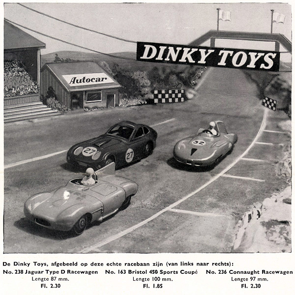 Jan and Dave-- Of course you are both correct, and the rest of us should stop carping about incorrect colors on Dinky's. Meccano usually showed pretty good judgement on selecting the colors they did and you are right, those were commercial decisions, based on window appeal. The other blatant example of that was the streamlined Mercedes racing car made in white....those cars were always silver, but with the plethora of post war silver racing cars, Meccano likely wanted something new and different, and not silver.My only point with the D-Type particularly, was it was without question the most famous racing car that England produced in the 1950's and it absolutely dominated Le Mans for several years. I also still think that Mecanno did a relatively poor job with the casting; to me it is an awkward looking car and shows little of the real beauty of the prototype....especially the front fenders and the sides of the model. But the D-Type has complicated curves and lines and would not be easy to do. But none of this really matters...I am sure that the D-Type was a resounding sales success for Mecanno!! Terry