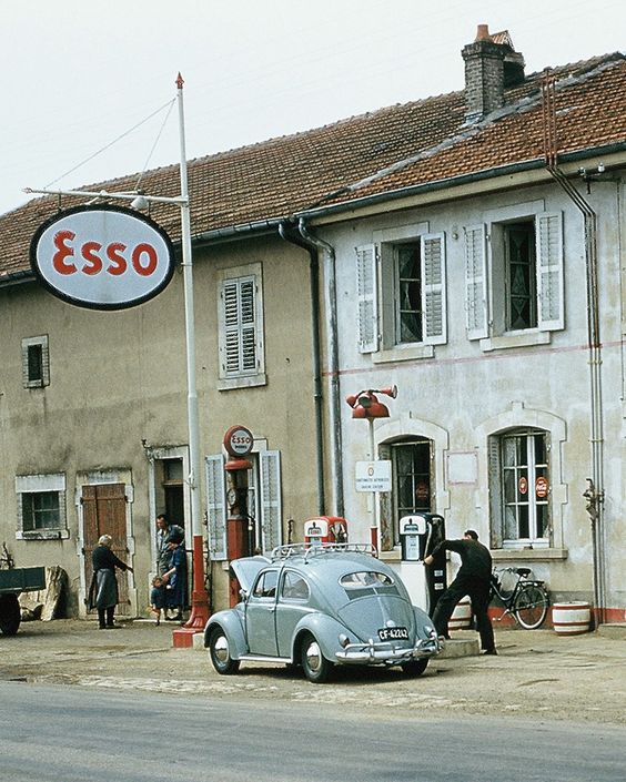 I came across this photo of a nostalgic Esso petrol station. It looks like the French Dinky Toys 49d and the British Dinky Toys 181. Given the nostalgic decor of the buildings and a Volkswagen (with oval window) with a French license plate, it also seems to be in France. It is probably a standard Esso petrol pump station in France in the 50's. Note also the black Solex against the wall, which were produced in France. The pillar with Esso plate is also white with red from below. The oval gray concrete island on which the 2 pumps are located is also clearly visible. The high red Esso pump on the left side is an older pump. Note the 3 aeration pipes that rise at the wall till the roof. There will be 3 tanks underground. At the time, Esso had normal and super gasoline for sale (the red and the blue pumps) and the high red pump will probably be for diesel. In the Netherlands there stood a well-known Esso service station of that time along the roads with a characteristic form (V roof on a glass kiosk) of the architect W.M. Dudok, who built 112 of them from 1953-1967. One of them fortunately has been preserved as a museum piece by Louwman & Parqui Toyota museum in Raamsdonkveer.