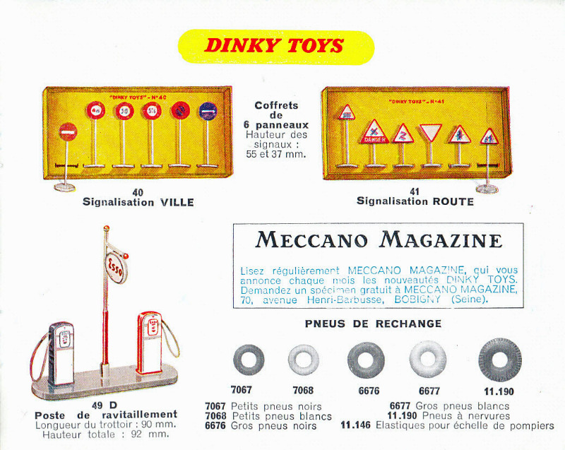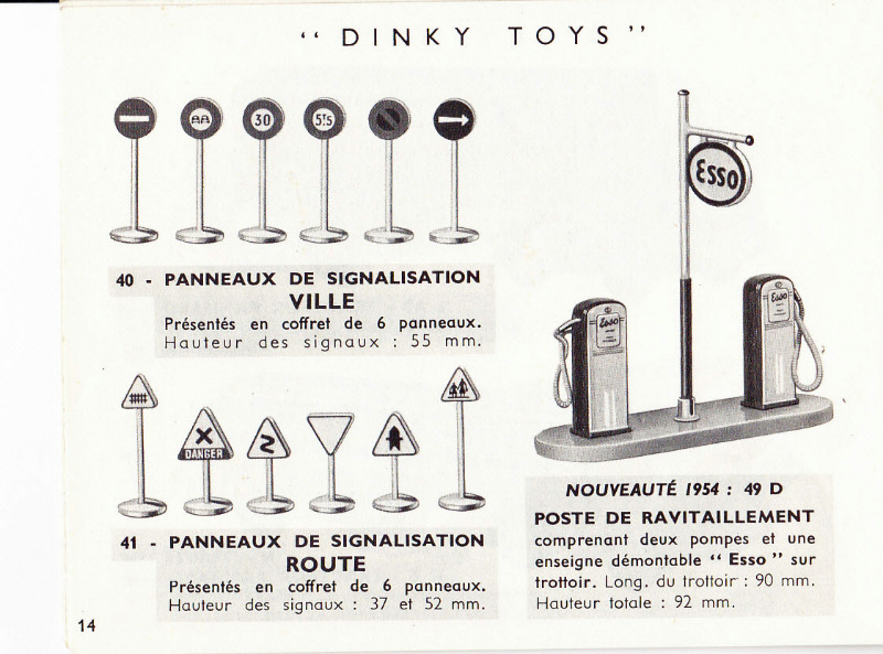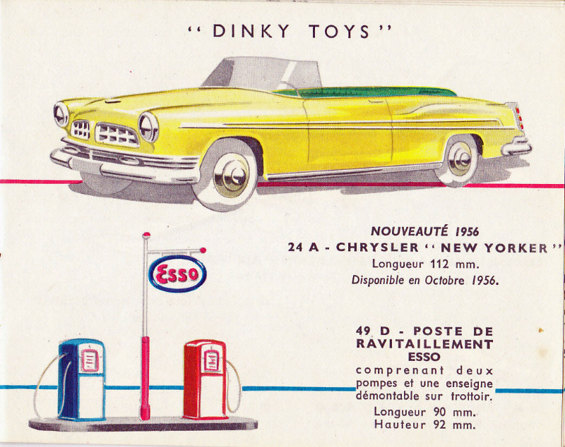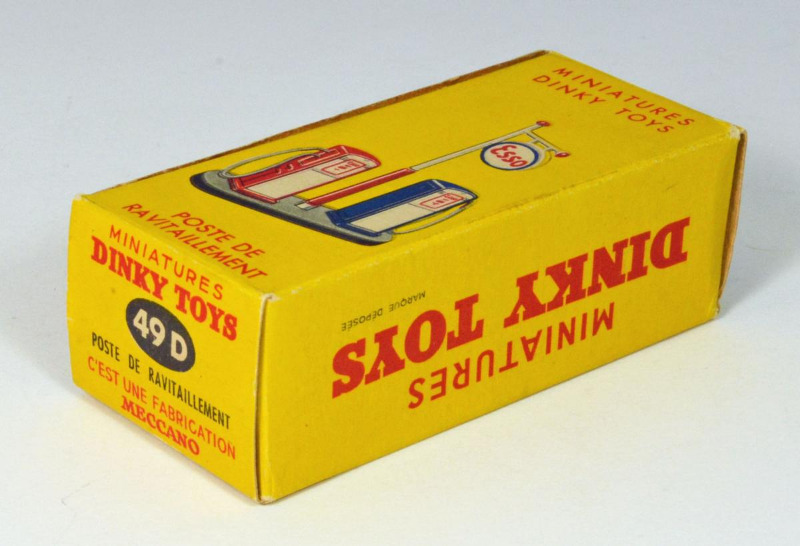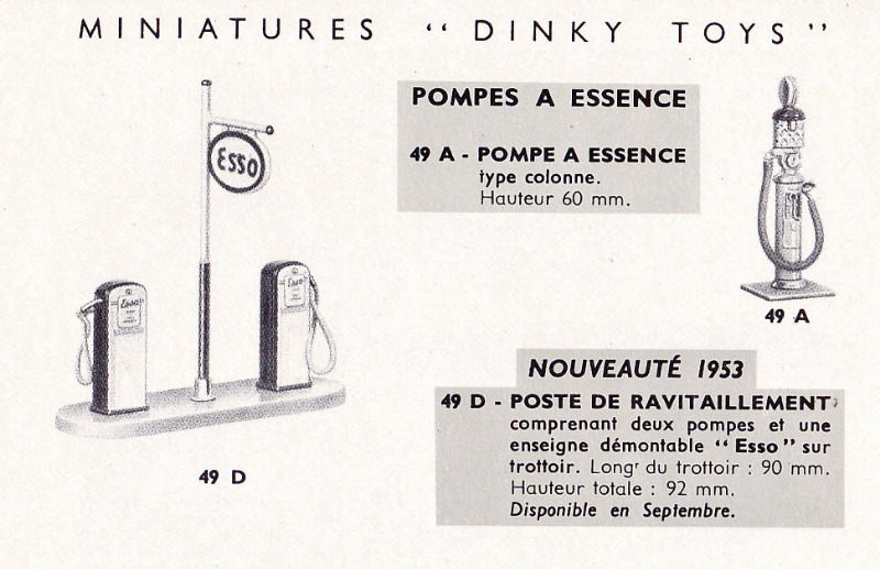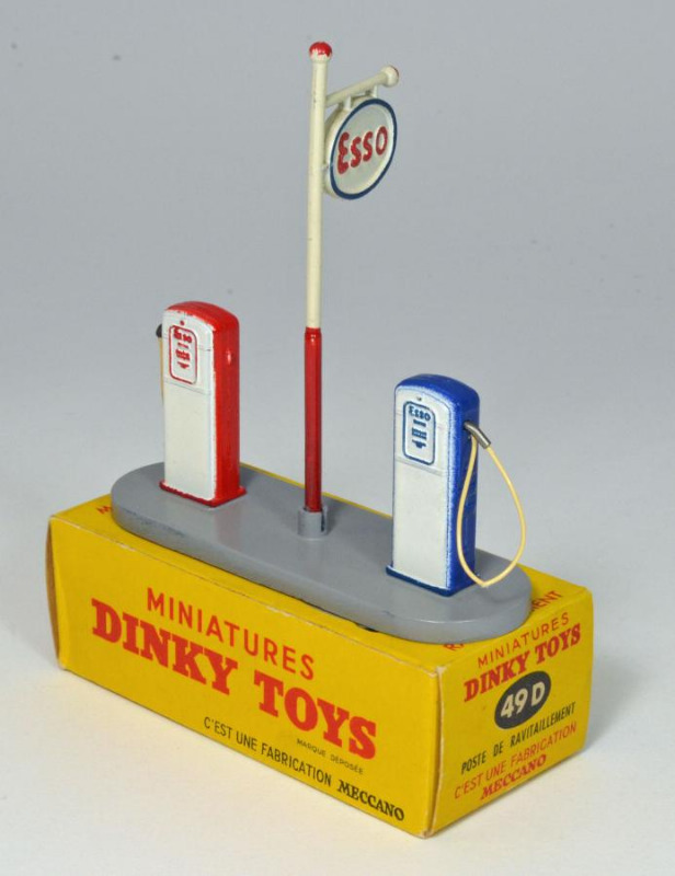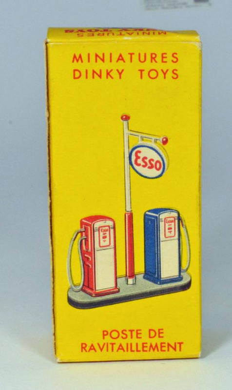 I was a little surprised to not see any prior postings on this nice French Dinky Toys accessory, so decided to show a recent arrival in my collection. The 49d Poste de Ravitaillement or Esso Service, as it was called in the English catalogs, was originally shown in the 1953 French catalog, saying that it would be available in September. For some reason, that was apparently delayed, as it was then shown as a new item in the 1954 French catalog, and was also announced in the French Meccano Magazine. One reason for this might be that, according to the Dinky Toys Encyclopedia and Jacques, it was not made by Meccano, but an outside subcontractor. Since this is his material, I will Jacques amplify on that if he chooses. But possibly there were some difficulties with the die, etc., that caused that. I bought my first version of this when just a young boy, around 1957, and I still have it, but it is decidedly the worse for wear, and is now missing its hoses. I did, however, recently purchase another one, and had just received it a couple of weeks ago. This one is apparently somewhat older, as the box it came in features the early wording 'miniatures' along with the usual Dinky name. I have never read just what time period this encompasses, but am guessing only for a very short time....possibly only through 1954 or 1955. My very early 24v Buick Roadmaster has the same wording on its box. The only other difference that I can easily discern is that the holder for the upright Esso sign is a little shorter on the older one. The very small sheetmetal nozzles are also slightly shorter on the older version. Many of the ones shown on eBay are also missing some or all of the original hose. My new did have the hoses intact when I received it, but upon carefully handling it, one of them broke in two. They appear to get very rigid and brittle with age, and can break with the slightest movement. I am now trying to find a suitable replacement, although the only offered replacements are not white, but yellow. I am not sure of the scale of these pumps, but have always felt they were a little big for the cars and small trucks, but in looking at period photos, it appears that they were indeed about 6' high off of the ground when placed on those platforms, so maybe they are not too far off. Any other comments or information would be greatly appreciated! Best regards, Terry