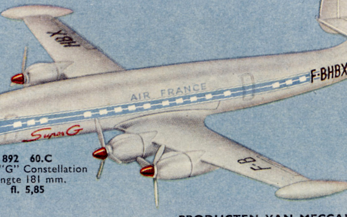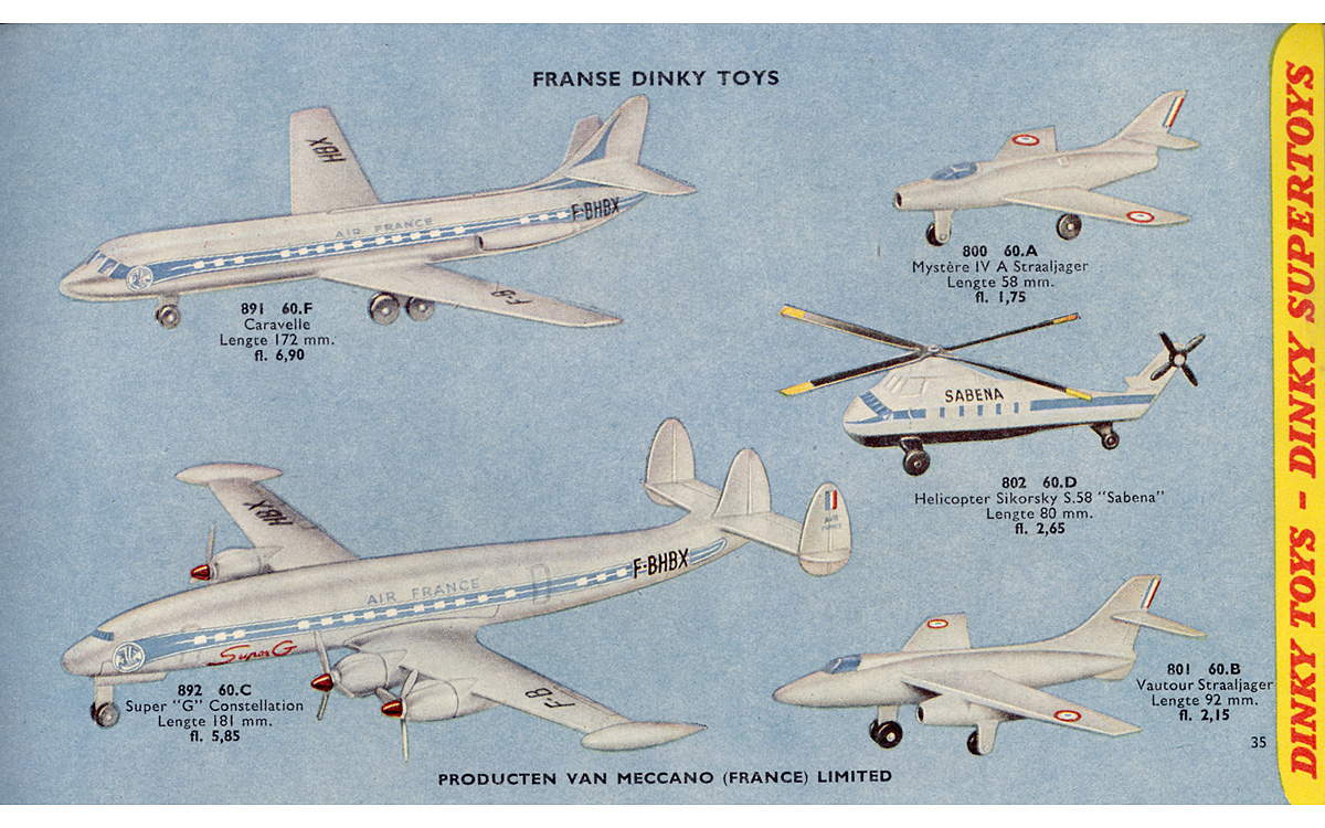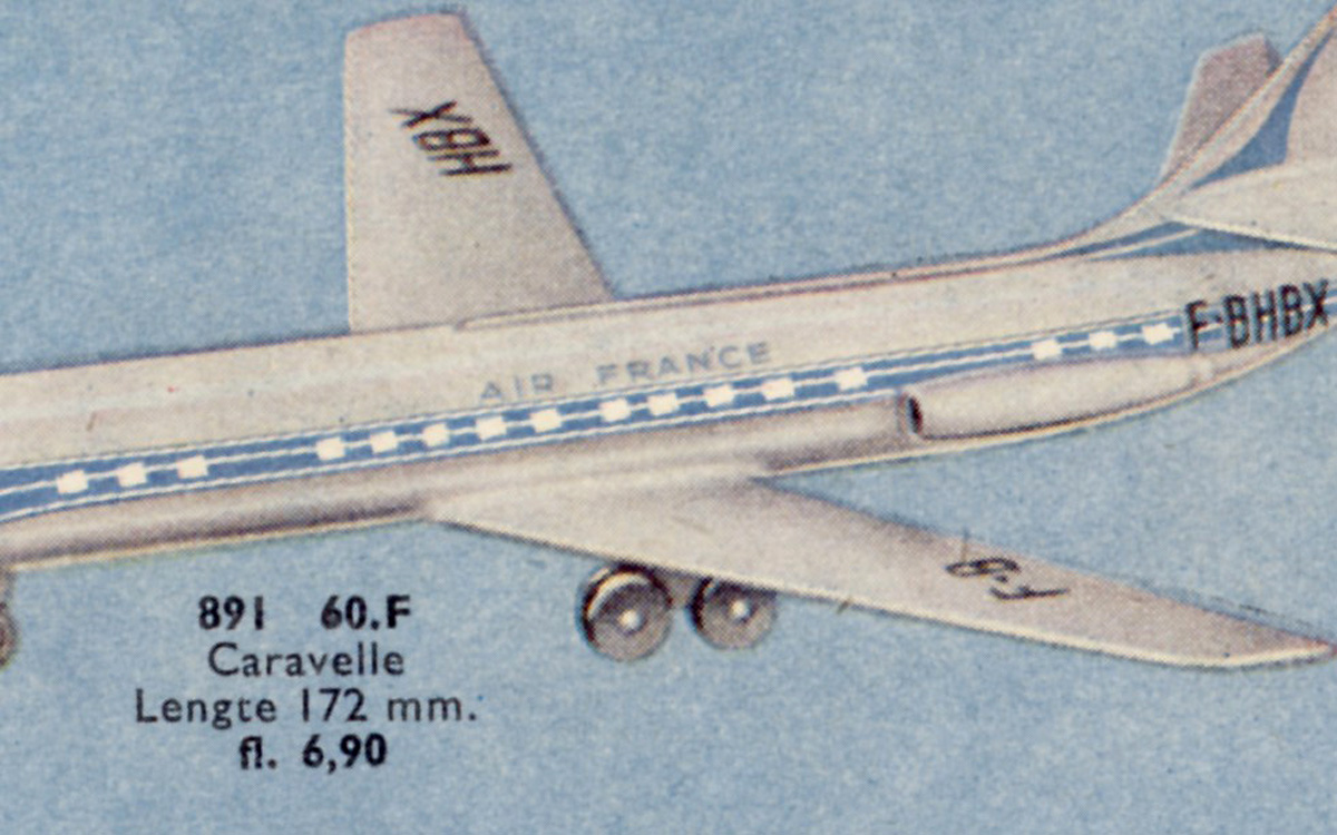 Two remarkable catalogue misrepresentations of the Caravelle below: 1. The introduction as a 'nouveaut' in the French 1958 Meccano catalogue, showing a straight blue band, even extended over the cockpit area and even over the engines sides. The blue tail flash is very plump compared with the actual model. The AIR FRANCE capitals are too large as is the odd CARAVELLE name at the front of the blue band. The main landing gear seems to be represented showing tyres. 2. The Dutch (and other similar) 1959 Dinky Toys catalogues show a fully distorted Caravelle model. Possibly lacking an appropriate example or just being in a hurry to finish the job the artist apparently 'borrowed' the main fuselage and wing details of the Super Constellation, the registration numbers included. A fantasy cockpit and a crude, plump tail section were added to complete the design.