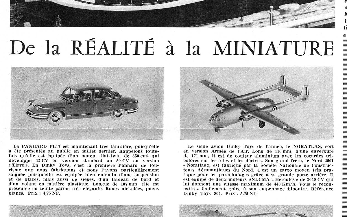 Another draught text for my private catalogue, freely translated into English here, to share with you, and to possibly arouse some comments and suggestions. Now about a very nice new addition, the French Noratlas cargo aircraft. This remarkable model of a Noratlas 2501 was issued as the last of seven post-war French aircraft models in 1960. Therefore, it never had an old number in the 60 series, but it was the only one to be directly incorporated in the low new 800 numbers, to which also the old 60 numbers with a Dinky Toys status moved (the Supertoys - Caravelle and Super Constellation - went to the 890s). In order to have a fully closed fuselage below, it was inevitable to use two castings. The smaller lower casting is attached to the upper casting of the fuselage, tail and wings by means of two rivets. The vertical seams between these are clearly visible both at the front and the rear of the fuselage. The three black landing wheels, one small (6 mm) in front and two larger (8 mm each) main wheels behind, could be borrowed from earlier aircraft models. The red brass propeller pins were previously applied to the Constellation, but the unpainted large four-blade propellers were new, exclusive to this model. The blue / white / red roundels on top of the wings and on both sides of the tail beams were previously used for both fighter jets (Mystre, no. 60a / 800, and Vautour, no. 60b / 801). The rectangular tricolor transfers on the tail rudders are draped around the rear. Like all French aircraft, the colour is not silver or aluminum but metallic grey. The strikingly bulbous front shows no fewer than fourteen small cockpit panes in relief that have been painted blue very accurately. The same bulbous rear end shows the double folding cargo doors and on both sides the access doors, which were also used by the paratroopers. The model on the 1/192 scale is beautifully finished with crisp details such as the cockpit windows, the wing flaps and the windows etc. on either side of the fuselage. During its rather short career, nothing seems to have changed as the model is concerned. The yellow box with end flaps (13 x 12.5 x 3.5 cm) is slightly larger than that for the Vickers Viscount (no. 60e / 803). The model is held in place inside surrounded by a 3.5 cm wide perforated strip of supporting cardboard. It is not uncommon for the model to slide within its box, leaving unwanted perforations of the sides caused by the sharp wing tips. On the sides of the box the following texts can be read, which tell more about the actual Noratlas: Below: Le Nord 2501 Noratlas est un avion franais fabriqu par la Socit Nationale de Constructions Aronautiques du Nord. Cest un cargo moyen facilement utilisable pour les parachutages grce sa grande porte arrire. Il quipe de nombreux groupes de transport de lArme de lAir Franaise. On top: Long de 21,96 m, il a une envergure de 32,50 m. Deux moteurs SNECMA Hercules de 2040 CV lui donnent une vitesse maximum de 440 km/h. Son poids Total peut atteindre 20 tonnes pour une charge utile de 7.500 kg. Son quipage est de 3 hommes, son plafond 8.000 m, et son autonomie 2.500 km. Il est facilement reconnaissable son empennage bipoutre. [Translated: The North 2501 'Noratlas' is a French aircraft manufactured by the Socit Nationale de Constructions Aronautiques du Nord. It is a medium size cargo-plane that can easily be used for parachuting thanks to its large rear door. Many transport groups of the French Air Force are equipped with this plane. 21.96 m long, it has a wingspan of 32.50 m. Two SNECMA 'Hercules' engines of 2,040 HP give it a maximum speed of 440 km/h. Its total weight is 20 tons for a payload of 7,500 kg. It has a crew of 3, a ceiling of 8,000 m, and its range is 2.500 km. It is easily recognized by its twin girder tail]. The Noratlas was intended as a replacement for the common transport aircraft in use during and shortly after the war. It was a very successful design because several hundred units were built during the production period, which lasted for over a decade, from 1949 to 1961. It was also a successful export product, because the Noratlas also flew for the air forces of Germany, Israel, Greece and Portugal . They were in service for the French Air Force until 1989.