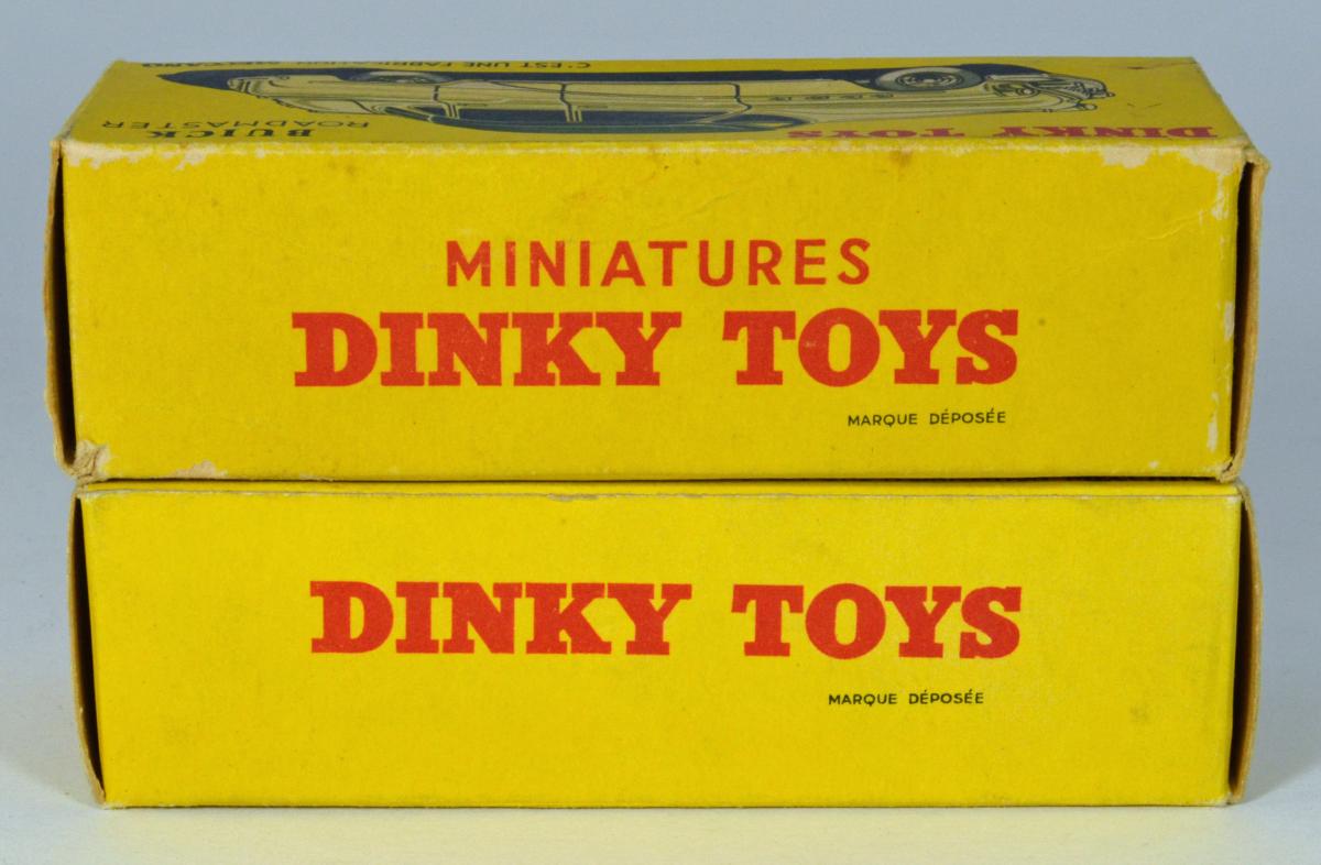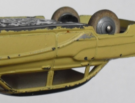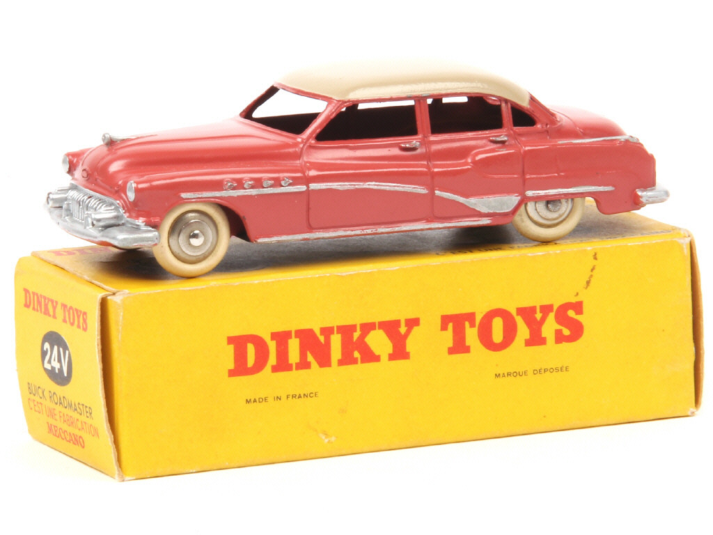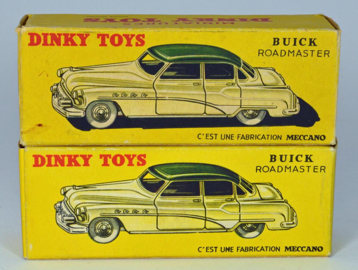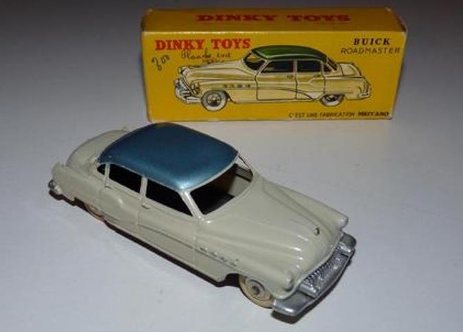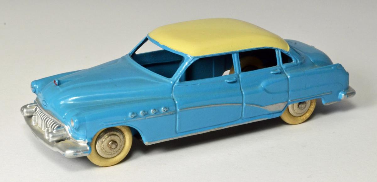 I am surprised that there are not more comments or posts on this most wonderful model, and since I feel it is one of my all-time favorite Dinky Toys, herewith are my thoughts and notes: This model was brought out by the French Dinky factory in January of 1954, and deleted in 1959, and it appears to have been modeled after the 1952 Buick Roadmaster. The real car is very similar for 1952 and 1953, but several key points serve to differentiate between the two. First and foremost are the prominent raised areas atop each rear fender or mudguard. On the real car, these are bright chrome, while Dinky has left them painted. For the 1953 Buick, these were deleted. The hood ornament and front grill and bumper details are also from the 1952 model, whereas the silver colored side detail or sweepspears as they were called here in the states, appear to be more from the 1953 model....mainly at the lower rear area where it sweeps down. In reading all of the reference material available, it appears that this particular model was (1). always in a yellow separate box (no trade boxes) and (2). always came with white tires. Early versions did come with a smooth inside roof area, which was later changed to the grilled type, and early models also came with unpainted Zamac wheels, which were later polished or chrome plated. Another variation is the previously mentioned side trim; on most Buick models, this has been very nicely painted silver (the real car used bright stainless steel), to a very good effect, as that detail adds considerably to the look of the car. On some versions, however, this has been omitted, and the trim is simply painted the body color. This change has been noted by some of the sellers, but I could not find any documentation or even discussion of it, so I do not know if it the non-silver was an early version, later changed, or just a lapse.....maybe the mask or special equipment used broke down? Since I feel that it adds so much to the neat look of the car, I made sure and found my models with it. Another change I noticed, after my last purchase, was the yellow box. At first, it looked just like other yellow boxes from the mid-1950's, but on close inspection I noticed that the illustration of the car, on both sides, had a 'shadow' added to it. And sure enough, one of my reference books on French Dinky's does mention that both types of box exist, but again, with no information on when that occurred. In re-looking and comparing the boxes, I also noticed that the wording 'miniatures' appears above the Dinky Toys name, both on the side of box and also on both end flaps. I do not remember ever seeing this before, so maybe someone can comment on that. My own thoughts are that this last Buick I bought, the mid-blue with dark blue roof, unpainted Zamac wheels, smooth inside roof, was a very early model, and that likely, this was also an early box. There are photos below showing this. My very first experience with the Dinky Buick Roadmaster came in 1959, when another friend and I both had the grand idea of writing the French factory directly, to see is we could purchase items from them not available in the states. My friends mother spoke and wrote French, so she composed a letter from us, and a few weeks later, we got our reply.....yes, they would agree to sell directly to us, and they enclosed a 1959 French catalog. I promptly ordered one of the Buick Roadmaster's, as I had never seen one before. I was very lucky....when it arrived, it turned out to be the hard to find, somewhat expensive salmon and black color. Fortunately, I still have that model today, after buying it 56 years ago, and it is still almost mint with the box. A few years ago, I decided to try and find the other colors offered, and within a year had acquired very nice examples of the yellow and dark green, the light blue and cream, and lastly, the mid blue and dark blue. The remaining color version that I still need is the cream with metallic blue roof, which will be a challenge! Below are several images of this very nice model. The level of detail that the French Dinky factory bestowed on this car is amazing....the front grill is very intricate, and the accent/detail silver painting is superb....even the tiny rear trunk or boot handle is painted silver. The model is also very well proportioned and an very accurate rendition of the real car.Regards, Terry