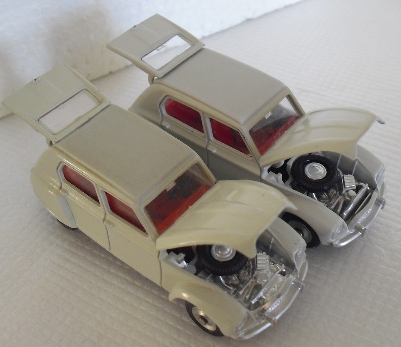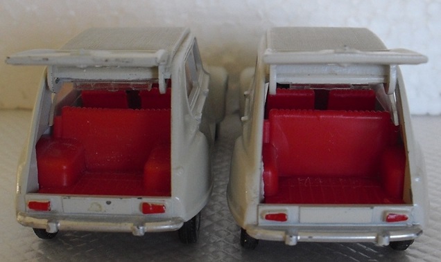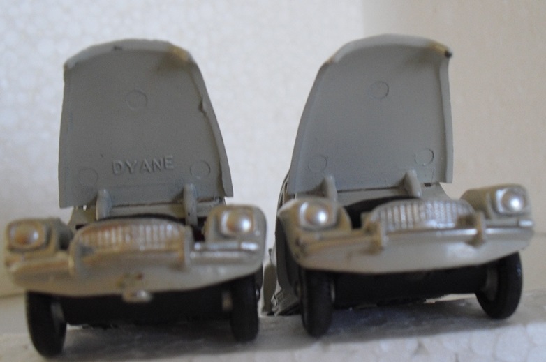 I already had the french version but not the 'made in spain' one ! This morning I got it and now I can compare the models. The differences between both models are much more numerous than J.M. Rouletwrote in his books and than we can read here and there ! So, to complete the observations already made (position of the reference number 1413, the rear axle structure and 'made in france' or 'spain here are the others variations : 1) On the spanish model 'Dyane' is engraved in the bonnet (as Jacques wrote in his encyclopedia) but also in the inside plastic roof. 2) The screw-head is different (but we know, as it's a moving piece, that it can be change ! I don't think in this case) 3) The rear red wheels-way are much bigger on the spanishversion. 4) The encravedtechnical and dating mentions '1/43' and '68' have disapearedon the spanish base plate. 5) The silver painting is applied under the rear bumper on all the surface. 6) The engine's front with no space in the spanish version (as in the english version ref. 149) I hope, you will be able to see all these modifications on the photos below. Friendly yours. Richard