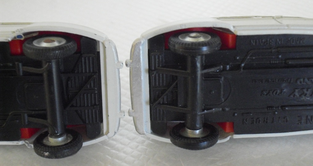 Richard, Sorry, I missed your post which you wrote while I was on holiday in Alsace / Lorraine. Thank you for this review of the French and Spanish Dyane. There are a couple more differences on the base plate. The marking which was 'Meccano Triang' on the French issue has become 'Meccano France s.a.' The reference number 1413 is written the other way around. The luggage have been lost some where. The base plate has been modified from the English one with the wrong suspension. The Brits had fitted leaf springs at the rear of the Dyane but this never was on the actual car. To fit with the British base plate, Pilen had to use the British tool for the interior with the wider rear wheel arches.There were no outings or over boxes for the Spanish Dinky, they were packed by six with shrinkable film.My French Dyane has plastic Dunlop tires, how are the Spanish tires ? (The spell check must be American) All your finds will be added to the Encyclopdia without delay. Jacques.