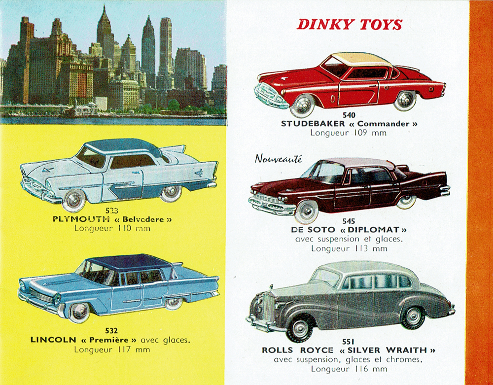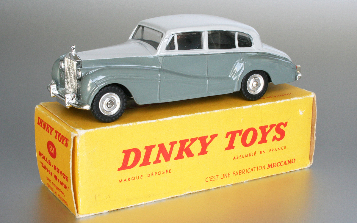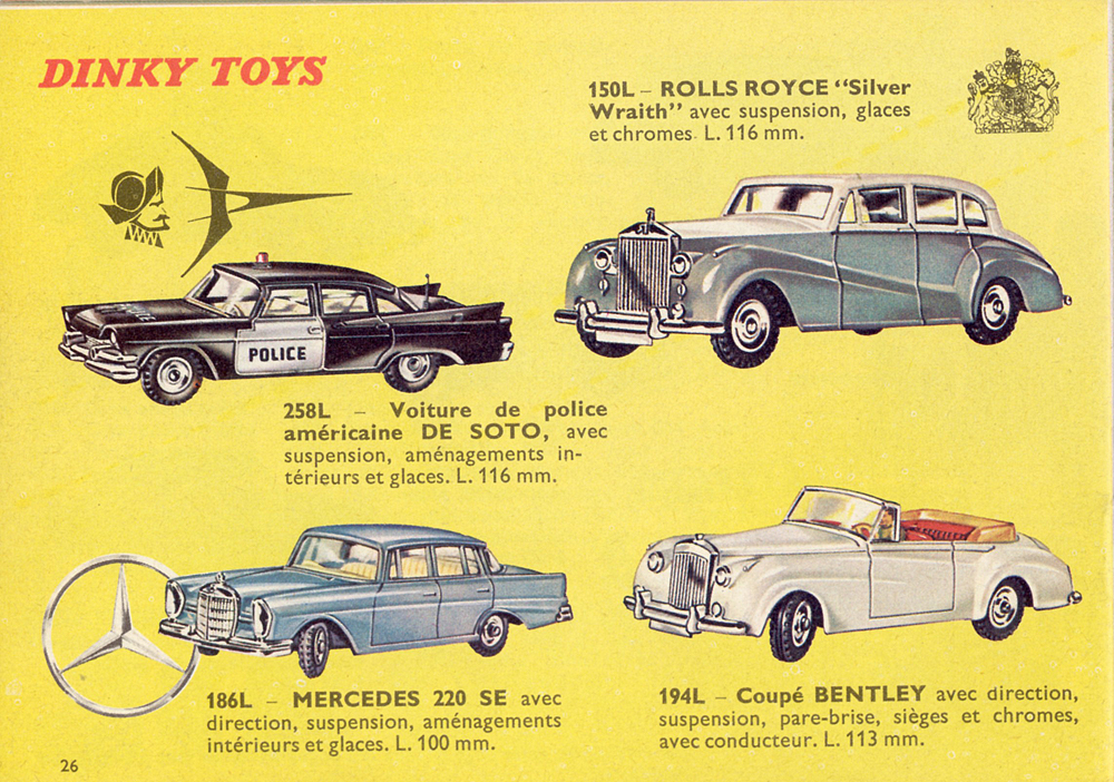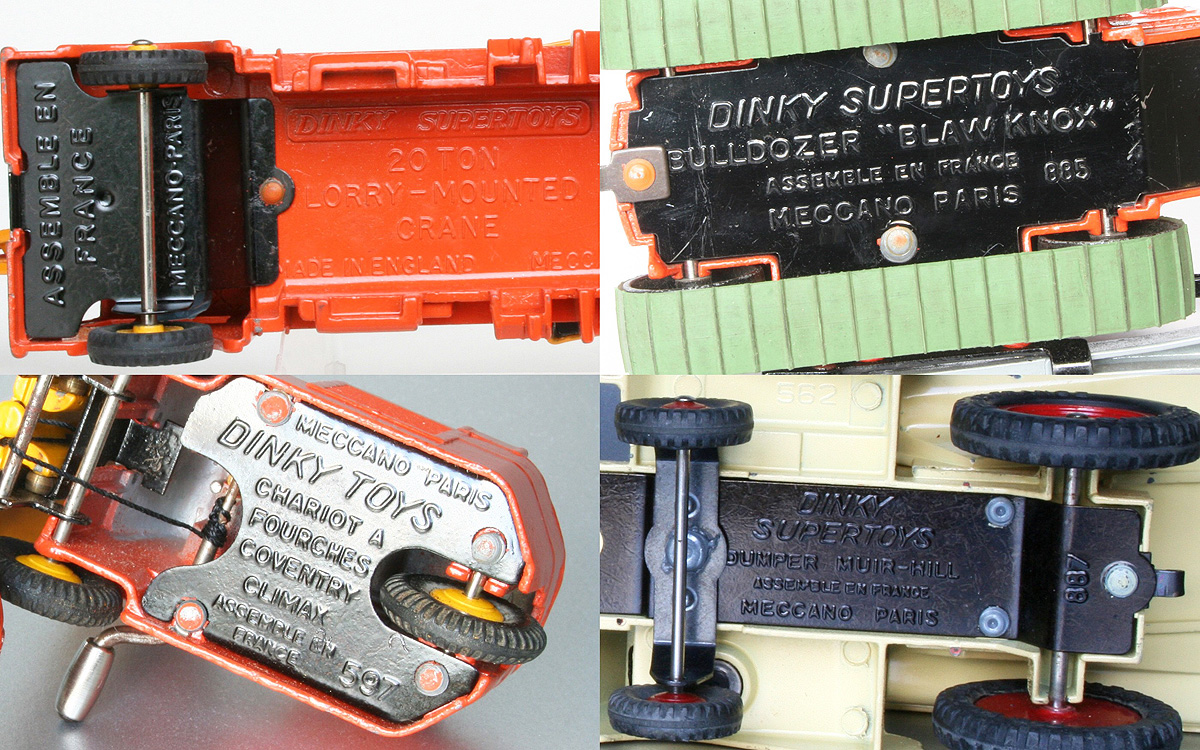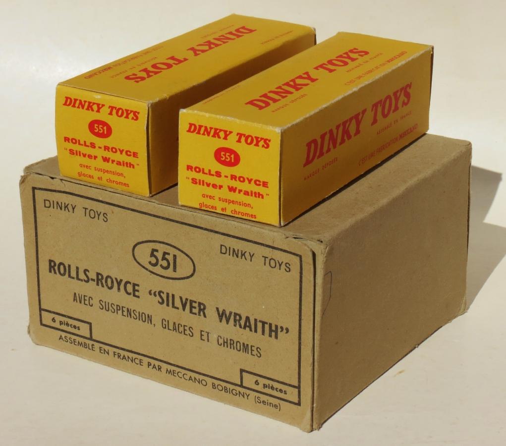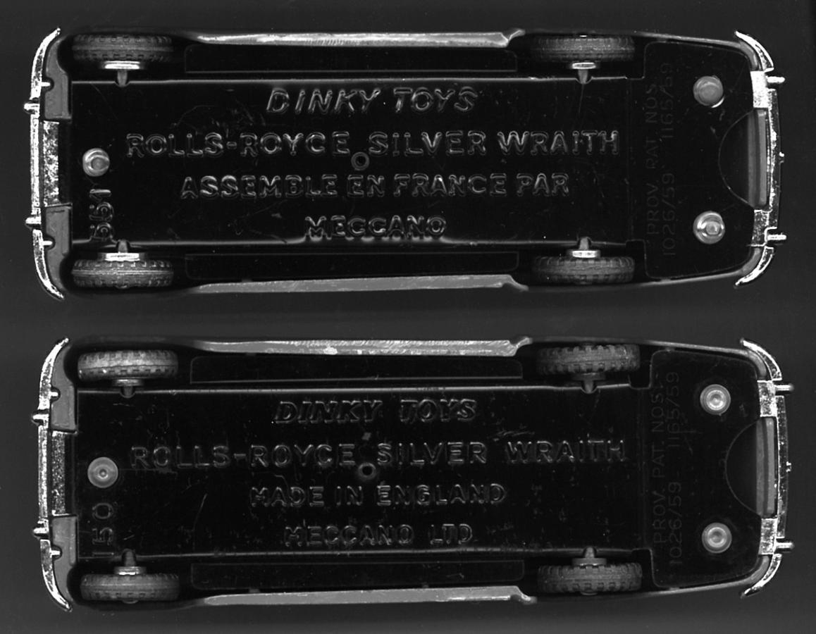 Hi all, coming across a scan which I made from the base plates of my British and French Rolls Royce examples some time ago, I thought it might be worthwhile for a remake of a contribution to the formerly very active Talkmodeltoys forum and post it here. This French Rolls Royce, is one of these remarkable examples in the relation between Meccano Liverpool and Meccano Bobigny. The parts were produced in England, shipped to France and assembled for the French market over there, in the Bobigny plant. As far as I know these Bobigny assemblies were not available anywhere else: the UK, the Commonwealth countries and the other export markets saw the original Liverpool products only. Some other complete British Dinky products were packed in (scarce) French boxes only, a simple way to expand the far smaller range of French Dinkies more quickly in the early 1950s. The easily exchangeable, more or less anonymous large commercials (i.a. the Coventry Climax 14c-401>597, the Blaw Knox Bulldozer 561-961>885, the Muir-Hill Dumper 562-962>887, the Coles 20t Lorry Mounted Crane 972>571) were in majority in this category (imported from England, or assembled and painted in France), as the distinct British cars were less suitable for the French market, because they were not that familiar on the French roads, like their own Citrons, Renaults, Simcas etc. But the prestigious, universally admired Rolls Royce was a rather lonely exception in the cars range in 1959. The Liverpool made parts were assembled in France, showing a distinct French base plate stamped assembl en France. The shades of grey are exactly the same, so, was the body possibly painted in Liverpool already? It looks if the patent statement in the smaller engraved characters at the rear of the base plate is exactly the same, so perhaps that sub-job was also done in Liverpool already? The model was packed in its own deviating French box, plain, lacking a picture of the model, and clearly stating Assembl en France. Both the box and the base plate showed the individual French catalogue number: 551. Probably this product was limited to one batch only. It was available in France (and its overseas territories?) only, a little shorter than the Liverpool example (it was introduced there in February 1959 already). Many more batches of the very common British made Rolls Royces no. 150 must have been produced by Meccano Binns Road for a much bigger market, because those are still very common and easily found. In France this model car, introduced in October 1959, was like the British one the first Dinky with suspension. The suspension idea must have come up rather shortly before its introduction, as this adaption in the design was made as late as December 1958! The catalogue representation of the French Rolls Royce was rather confusing. In 1960 it was referred to as number 551, in 1961 both the French and British numbers - 150-551 - were shown, and in 1963 a new designation was used: 150L, the L meaning Liverpool. The catalogues explain that these latter models were an article import en quantits limites. The 551 number neatly fits within the surrounding French numbers 550 of the Chrysler Saratoga and 552 of the Chevrolet Corvair. Or the other way round of course: the 550 and 552 etc. filled the range around the earlier introduced number 551 of the Rolls Royce. So, finally the Rolls Royce in the French catalogues was not a French assembly anymore, but just an English import, like so many others in that period. The other way round, many French made products were also sold on the British and other markets, both pre- (1938-1940) and post-war, (especially early and mid-sixties), and sometimes even assembled in Liverpool, like the (somewhat adapted) British version of the Caravelle (60f/891>997). Important other exceptions were of course the French Dinkies which were assembled in South-Africa in the first half of the 1960s. Although the French had their own Rolls Royce, the windows specification on the end flaps of the British boxes was next to Spanish, Dutch and German also in French. That was to apparently serve the French speaking people outside the French territories, like in Belgium, Quebec, Switzerland etc. By the way: it can be observed that the French Rolls was more tightly stored in its smaller box than its British counterparts. Kind regards, Jan