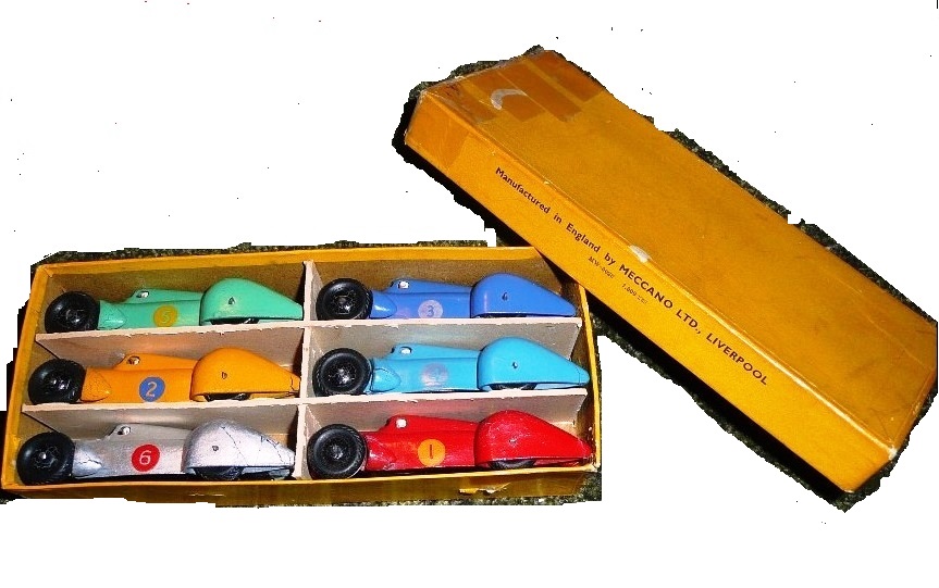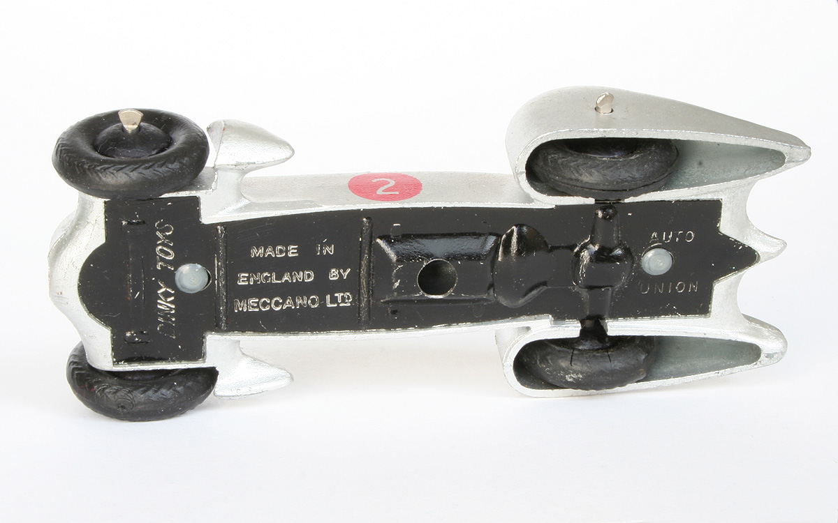 The French Auto Union and the British one, a comparison.French: green body colour only - British: silver, red, blue and yellow. French: post-war issue only - British: both pre- and postwar issues.French: smooth black 18 mm M tyres only - British: black or white 20 mm herringbone tread tyres. French: ridged red wheel hubs only - British: smooth or ridged black wheel hubs. French: racing numbers none or 1-6 - body colour in red roundel - British: none or 2 only, body colour in black, white or yellow roundel . French: smooth rear wheels caps - British: rear wheel caps with protruding axle ends. French: 'radiator cap' - British: no radiator cap present. French: individual French black base plate - British: individual British base plate, coloursblack or same as body colour. French: no driver - British: with or without driver. French: packed in trade box only - British: packed in trade box or (pre-war only) 23 Racing Cars presentation box.Please add and/or correct, kind regards, Jan