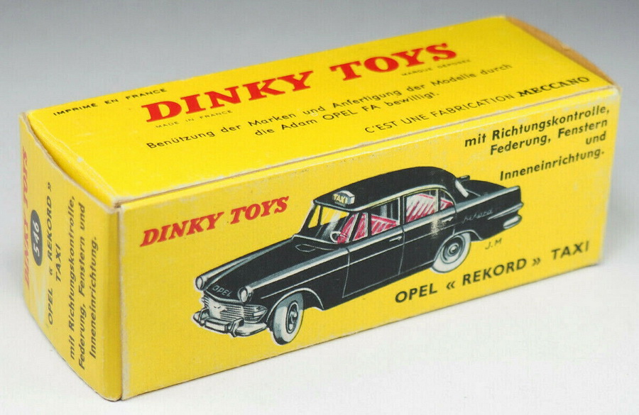 Opel Rekord P2 taxi in service. Shortly after the 554 I acquired the French 546 Opel Rekord Taxi as a companion to my 554 Opel Rekord. It is in a very nice condition with a fresh and strong box. The French 546 Opel Rekord Taxi was intended for the German market from 1964, but was also available in France according to the 1966 and 1967 French catalogue and that is remarkable. I think the stock had to be used up. It replaced the 554 available from 1960-63 and came together with his successor DT 542 Opel Rekord A with 2 doors. The 546 box is made with German text and this combination of model and box is unique in its kind, is scarce and hard to find in any condition. So I am very happy with this acquisition in such a nice condition. The car is completely black with a taxi sign with yellow letters on the roof, but without a taximeter that the 24UT and 24XT do have. The black body together with its silver detailing and red interior I find a very beautiful colour combination. According Jacquess encyclopaedia was the Dinky Toys 546 Opel Rekord Taxi already included in catalogue West Germany 1964.