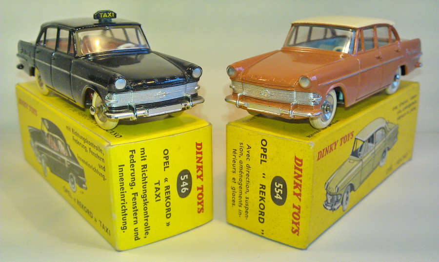 Dinky Toys 546 Opel Rekord Taxi in catalogue West Germany 1964. Note also the German export model DT 551 Ford Taunus 17M Polizeiwagen and DT 542 Opel Rekord as successor of the 554. Photo by courtesy of Jacques Dujardin.