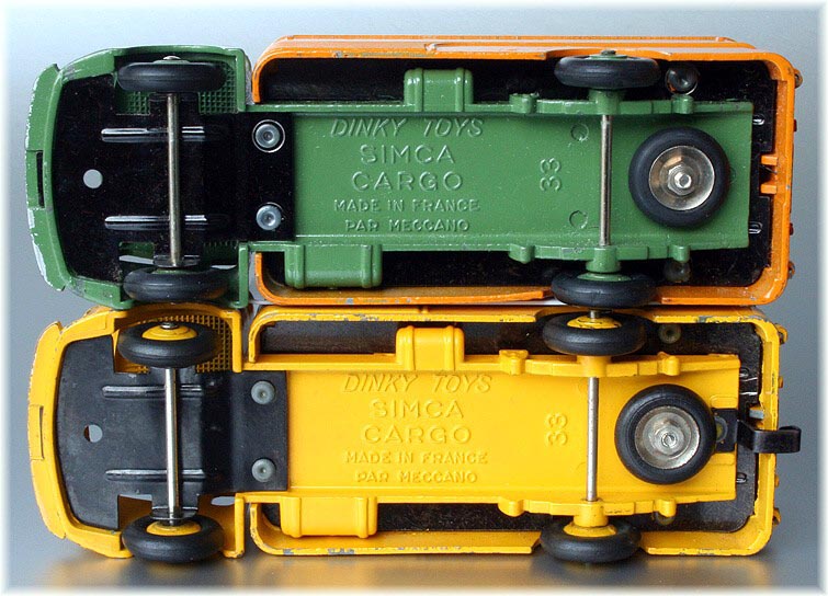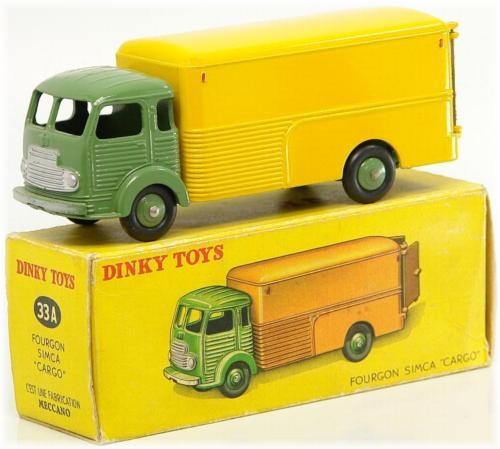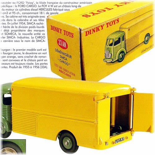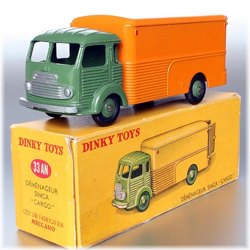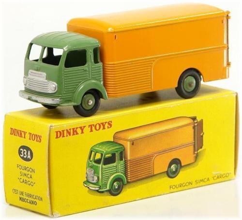 As usual with most Dinky Toys there are several variations. The pilot lot models or were they colour sample had yellow chassis-cab and hubs and green box van as shown on the 35mm Meccano advertissement films played in the cinemas around 1955. The boxes were : 33a with yellow box van 33a with orange box van 33an with yellow box van Is there a 33a box without drawings ? The trade box (called an outer by Meccano) for three models of the Bailly is printed 33AN and the later ones have been marked 577 by a red rubber stamp. I have not yet seen a 33a outer. On the yellow vans only (not on the orange), the rear door handles are bent down like on the Guy vans. There were two different dies (unlikely a two cavities die) used during all the production period for all the different Cargo models : tipper, glazier. The position of the marking and the cab' foot steps are different for each die. The pilot lot models were marked CARGO only without the SIMCA name. Meccano knew that there were talks between Ford s.a.f. designer and manufacturer of the Cargo and SIMCA to merge the two companies and waited until the deal was completed to add the new manufacturers name. The catalogue of 1954 announced the Cargo as a Ford truck but it was issued as a Simca in April 1955 ? All the real Simca Cargo trucks had twin rear wheels but Meccano saved some money by fitting single wheels. From late in 1956, the spare wheel boss has been raised when the tow hook was added. Copies of the 33AN Bailly and 33c Glazier lorry have already been issued by Atlas, one can bet that the 33b tipper and 33a yellow van are not far away.