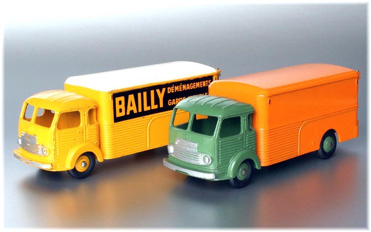 Two basic versions with slightly different catalogue numbers were available, firstly the plain one, no. 33a, with a dark olive cab and yellow back (subsequently the lighter olive cab and orange back) of 1955-1956 and the attractive all yellow one, no. 33an, with white roof and advertising Bailly removals of 1956-1961.Now my questions below are about the boxes of these vans, as they seem to have been mixed frequently in practice.