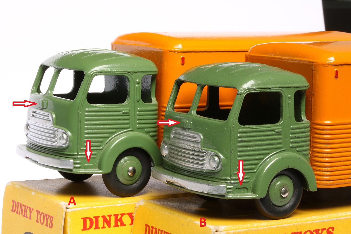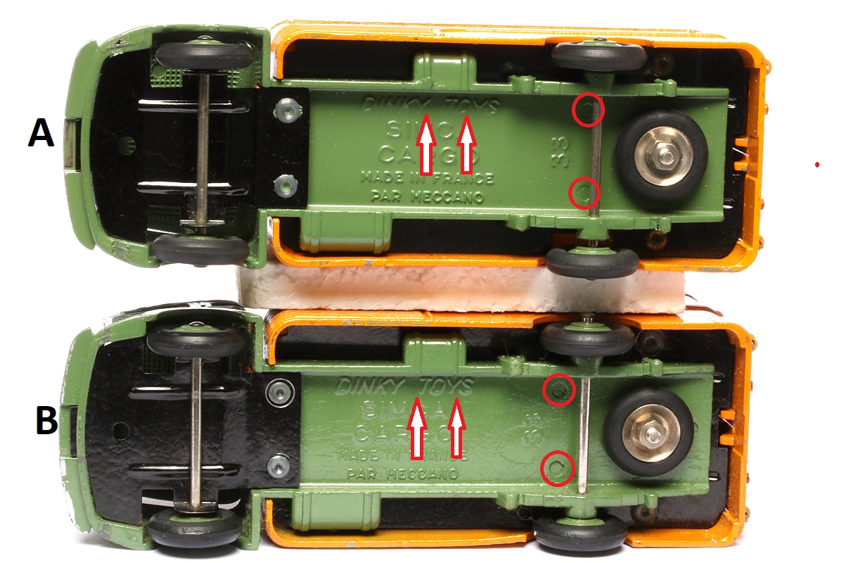 Having a couple with both A and B type cab/chassis units at my disposal now, I can indicate more clearly their differences, which are: - Size of the badge above the grille - Inverted door steps - Position of the lettering underneath (as seen in relation to the fuel tank's raised lines) - Position of the ejection marks underneath (obvious in relation to the rear axle)