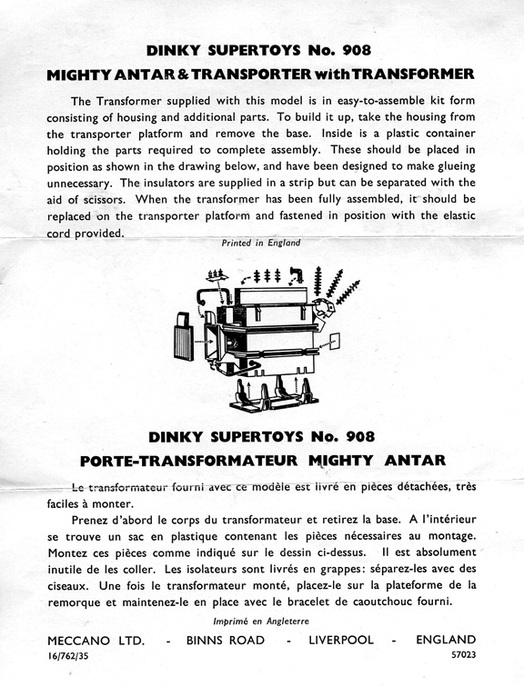 This is the instructions for the transformer which was avaiable separately from the truck as ref. 833. Unfortunately this is a picture only and one can not unfold the instructions sheet. What I do have is the instructions for the 908 Mighty Antar which must be very similar.If somebody can provide a scan of the unfolded instructions for the 898, it will be most welcomed.