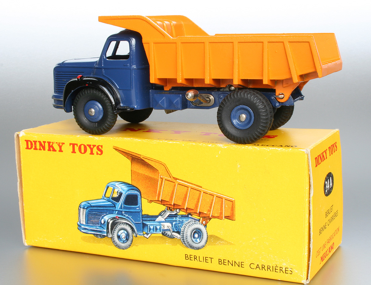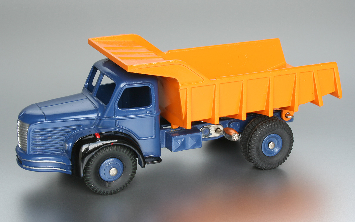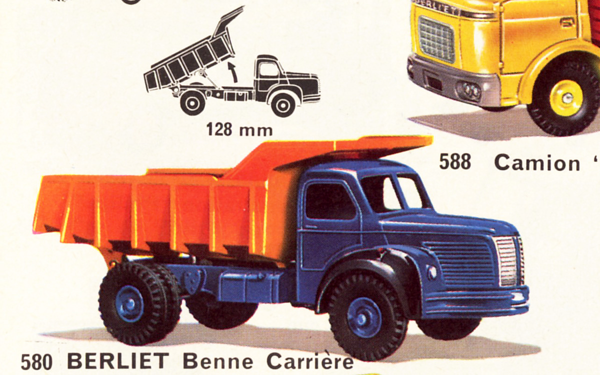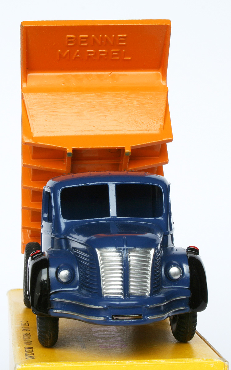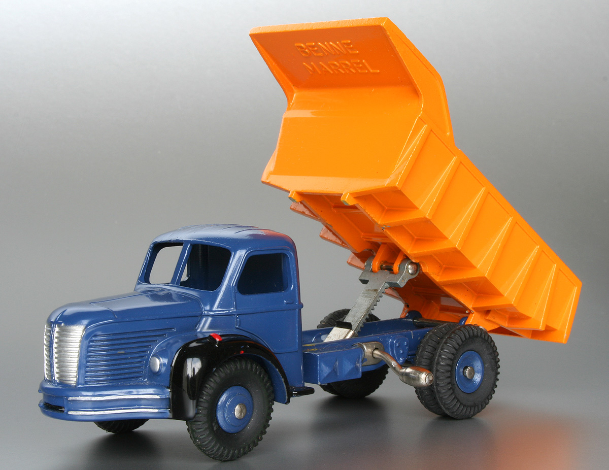 This Berliet benne carrire(s) Marrel, model of a Berliet GLM 10 dump truck (1953) is one of the most common French Dinky Toys, as it was in the catalogues from 1955 till 1970. Still, it was a remarkable one, as it was the first ever Dinky Toy with double rear wheels, a new and very realistic feature. It is of medium size with its 1/55 scale, but if the general English Supertoys scale of 1/48 would have been adopted it would have come closer in size to the big no. 965 Euclid Rear Dump Truck. It is a faithful and finely finished model, moreover including a unconventional new tipping mechanism, another feature in which it was the comparable English models far ahead. It passed the familiar changes of the French models: renumbering in 1959 to 580 and the coinciding change from convex to concave wheel hubs. Also the round treaded 20mm tyres were replaced by block treaded ones around that year. Another obvious difference is the later introduction of a hub for a never introduced spare tyre under the rear of the chassis. Later on the dark blue of the cab and chassis turned a little lighter blue, but no other finish changes took place during its long life. The heavy, sturdy container was made by the French manufacturer of this heavy duty material, Marrel. The model itself shows the lettering BENNE MARREL right under the front of the container, the piece above the cab. The mock-up of this model is still in existence, as Roulet shows in his second edition of Les Dinky Toys et Dinky Supertoys franais, page 345. The year 1955 showed many novelties in the French Dinky range, quite a few of them in the medium size smaller scale commercial / emergency models, like the Delahaye Fire Engine (32d), the Simca Cargo trucks and vans (33), and the Citron Breakdown truck (35a). Most groups of them complete in 1957. In advertisements on the back cover of the French Meccano Magazine the Berliet Dump Truck is often seen with the also 1955 introduced no. 33c Simca Cargo miroitier, the glass lorry. As said, the Berliet benne carrires is common and easily found, even in mint / boxed condition. Both its long life and the competition with the cheap Atlas replica (which looks very sterile and clean compared with the original) make it relatively affordable too. Kind regards, Jan