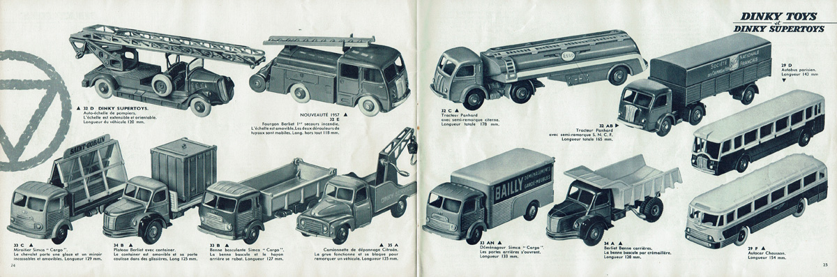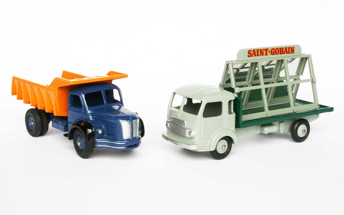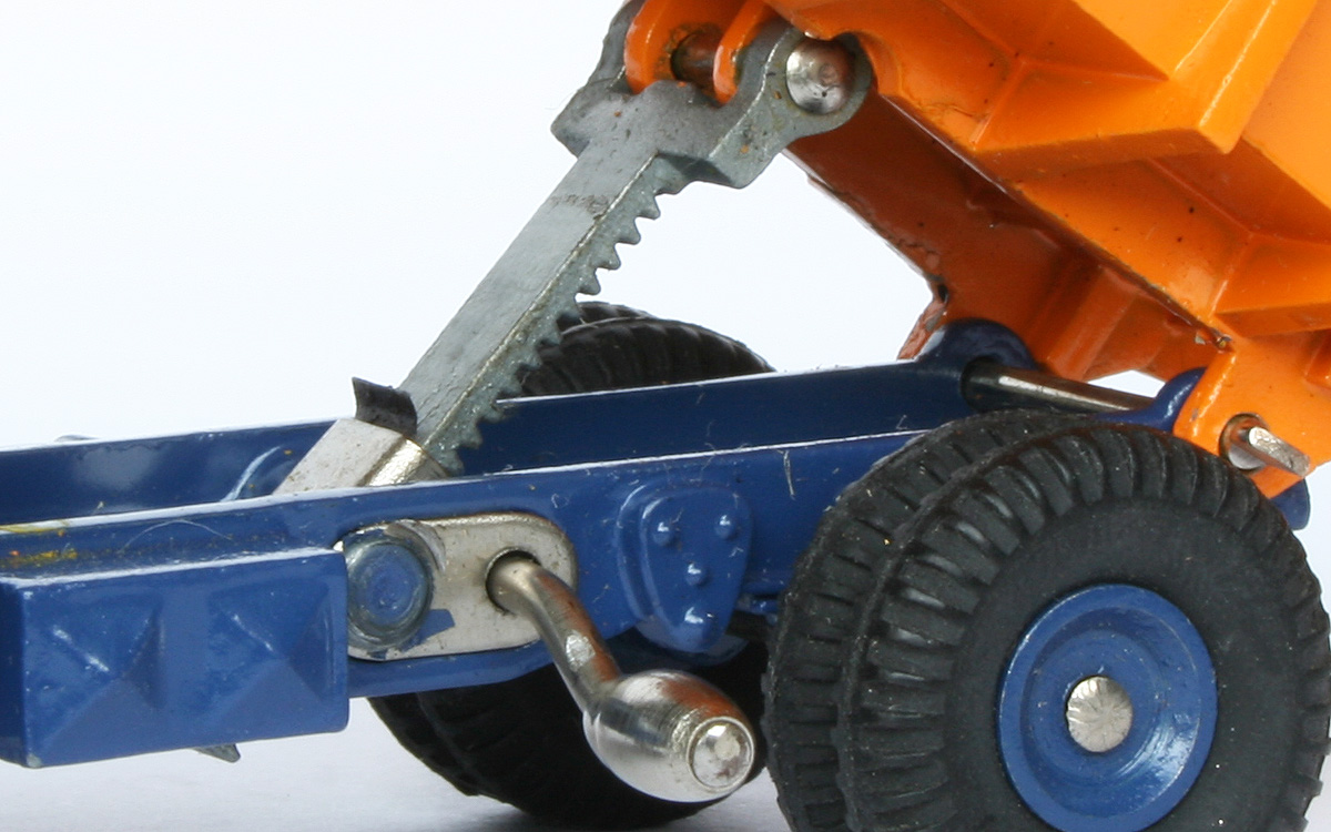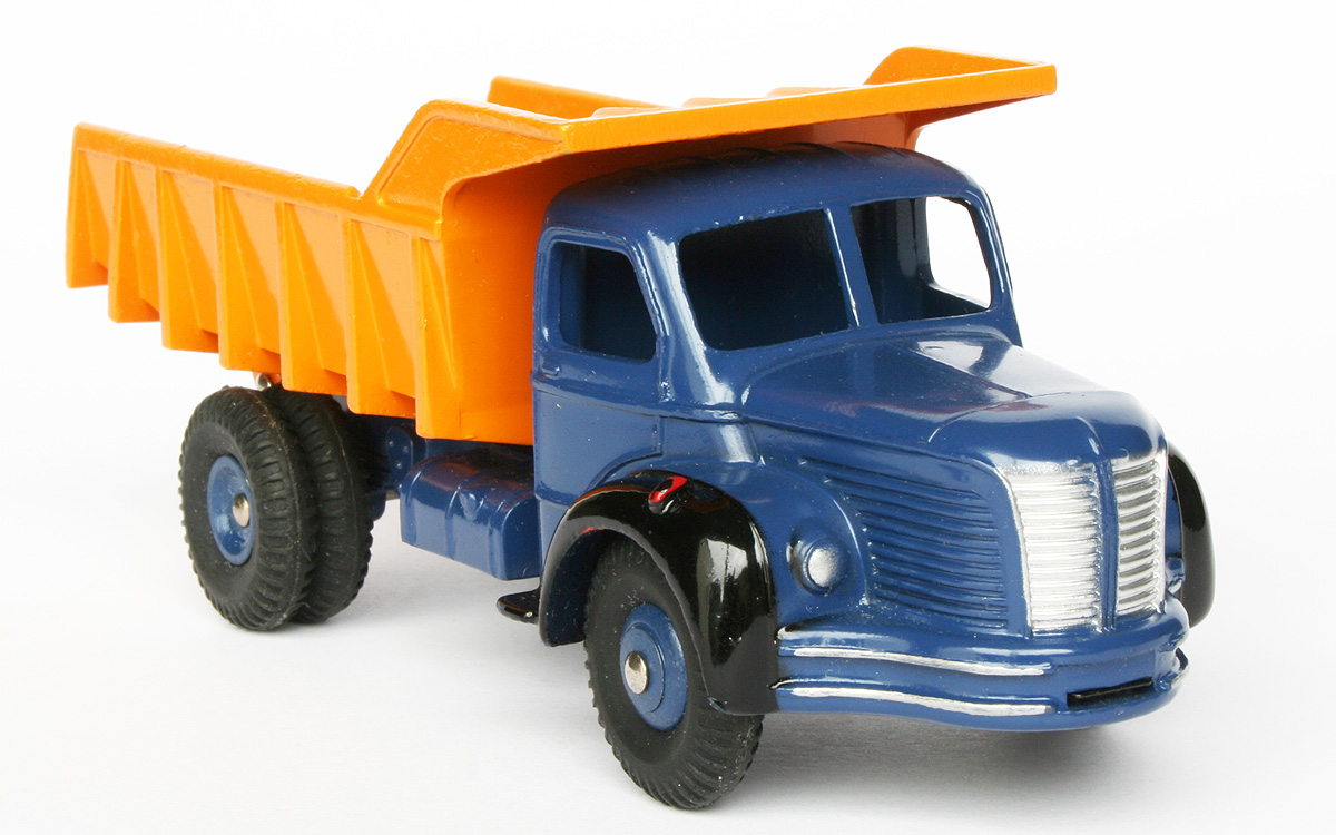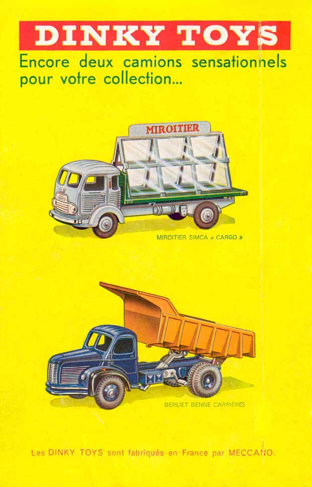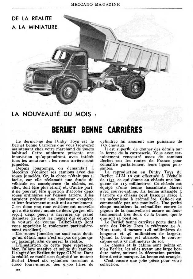 This Berliet benne carrire(s) Marrel, model of a Berliet GLM 10 dump truck (1953) is one of the most common French Dinky Toys, as it was in the catalogues from 1955 till 1970. Still, it was a remarkable one, as it was the first ever Dinky Toy with double rear wheels, a new and very realistic feature. It is of medium size with its 1/55 scale, but if the general English Supertoys scale of 1/48 would have been adopted it would have come closer in size to the big no. 965 Euclid Rear Dump Truck. It is a faithful and finely finished model, moreover including a unconventional new tipping mechanism, another feature in which it was the comparable English models far ahead. It passed the familiar changes of the French models: renumbering in 1959 to 580 and the coinciding change from convex to concave wheel hubs. Also the round treaded 20mm tyres were replaced by block treaded ones around that year. Another obvious difference is the later introduction of a hub for a never introduced spare tyre under the rear of the chassis. Later on the dark blue of the cab and chassis turned a little lighter blue, but no other finish changes took place during its long life. The heavy, sturdy container was made by the French manufacturer of this heavy duty material, Marrel. The model itself shows the lettering BENNE MARREL right under the front of the container, the piece above the cab. The mock-up of this model is still in existence, as Roulet shows in his second edition of Les Dinky Toys et Dinky Supertoys franais, page 345. The year 1955 showed many novelties in the French Dinky range, quite a few of them in the medium size smaller scale commercial / emergency models, like the Delahaye Fire Engine (32d), the Simca Cargo trucks and vans (33), and the Citron Breakdown truck (35a). Most groups of them complete in 1957. In advertisements on the back cover of the French Meccano Magazine the Berliet Dump Truck is often seen with the also 1955 introduced no. 33c Simca Cargo miroitier, the glass lorry. As said, the Berliet benne carrires is common and easily found, even in mint / boxed condition. Both its long life and the competition with the cheap Atlas replica (which looks very sterile and clean compared with the original) make it relatively affordable too. Kind regards, Jan