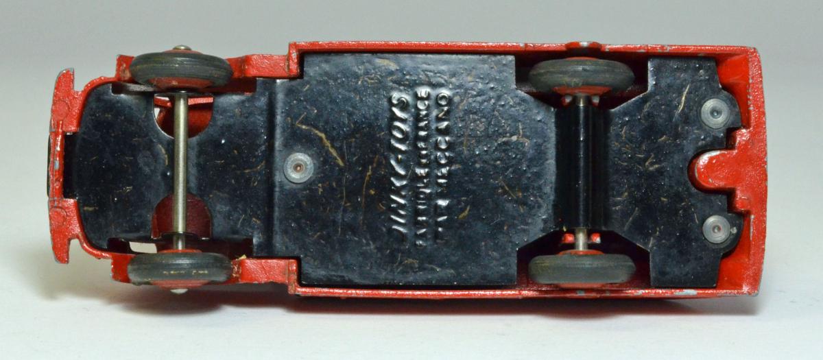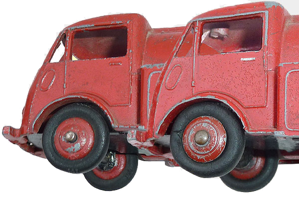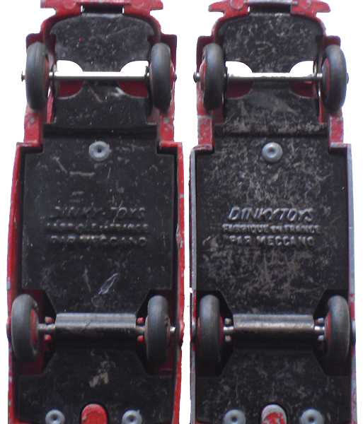 I assume that both tankers on the picture above are of the type 2 casting without rivet for the towing hook (which has never been fitted). This makes four variations : 1) Casting with tow hook bos and rivet for the towing hook, base plate with hyphen. between DINKY and TOYS. 2) Casting with tow hook bos and without rivet for the towing hook, base plate with hyphen between DINKY and TOYS. 3) As 2 but base plate without hyphen between DINKY and TOYS. 4) Casting without tow hook bos, base plate without hyphen between DINKY and TOYS.