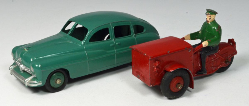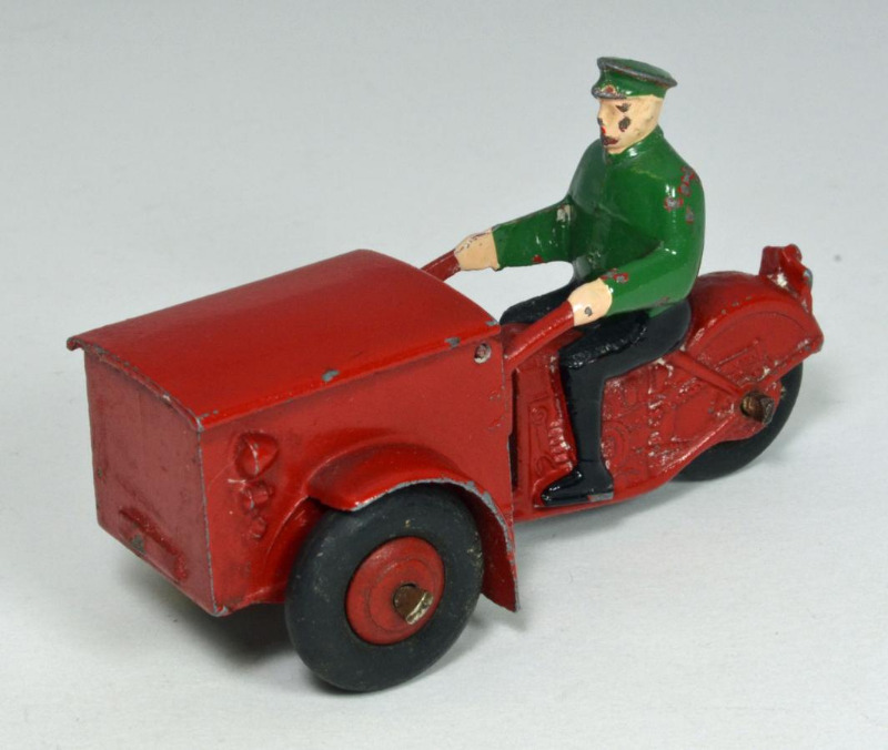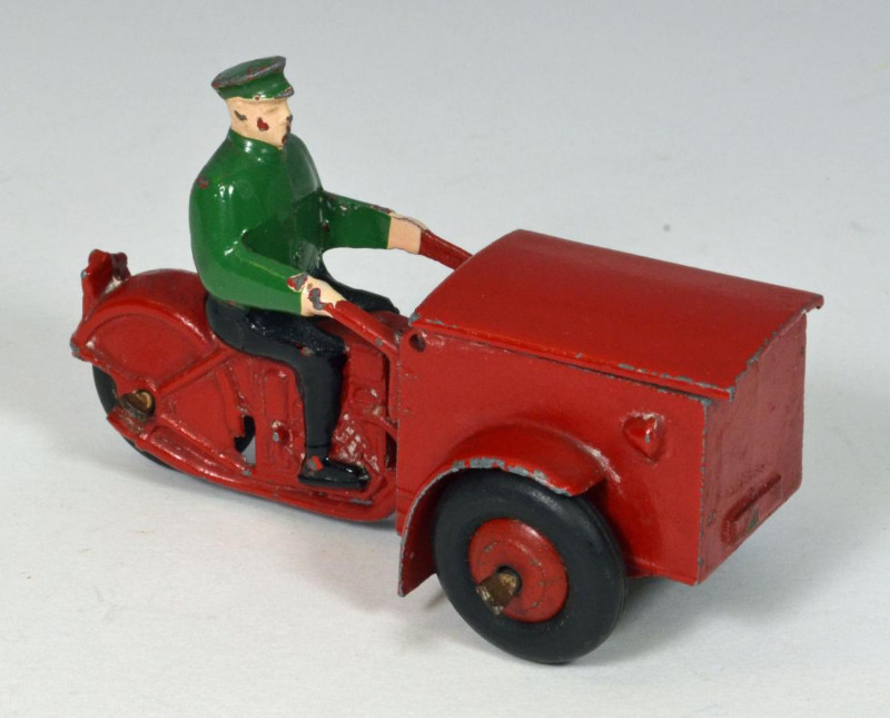 Just arrived today....a new model, and one I have been wanting for some time, the Tri-Porteur, #14. Some quick checking showed that this was introduced in 1935, discontinued during the war, then re-introduced right after the war, and made through 1952 before being discontinued. It was made in a variety of colores, both pre and post war. Earlier models has white Dunlop tires, and starting around 1950 they came with the familiar black 'm' tires, which mine has. The Dinky Toys Encyclopedia says the scale is 1:40, meaning this is quite a bit larger than the automobiles produced at the same time. A common problem with this model is the hinged lid coming detached from the box beneath it. It is held in place by only two, tiny pins, each protruding into the side of the box. The pins appear to be no more than about 1/3 the diameter of an axle, so they can break or dislodge very easily. I can imagine only light playing with this model would result in the lid disappearing! The French factory did a nice job in painting this, as the drivers pants and shoes are painted a contrasting color to his blouse or shirt. Hands and face are flesh painted, with some rudimentary effort made to highlight cheeks and lips on the driver. All in all, a delightful little model, from a bygone era, but so typical of Dinky to make a model of it. Regards, Terry