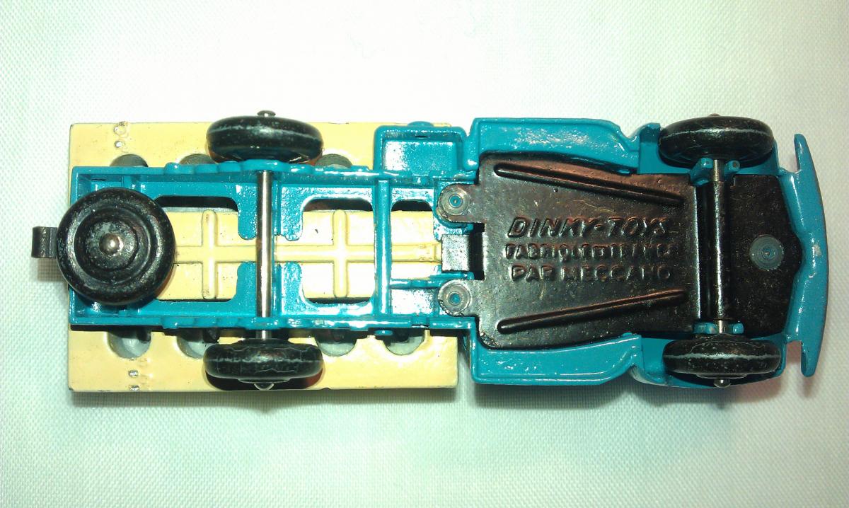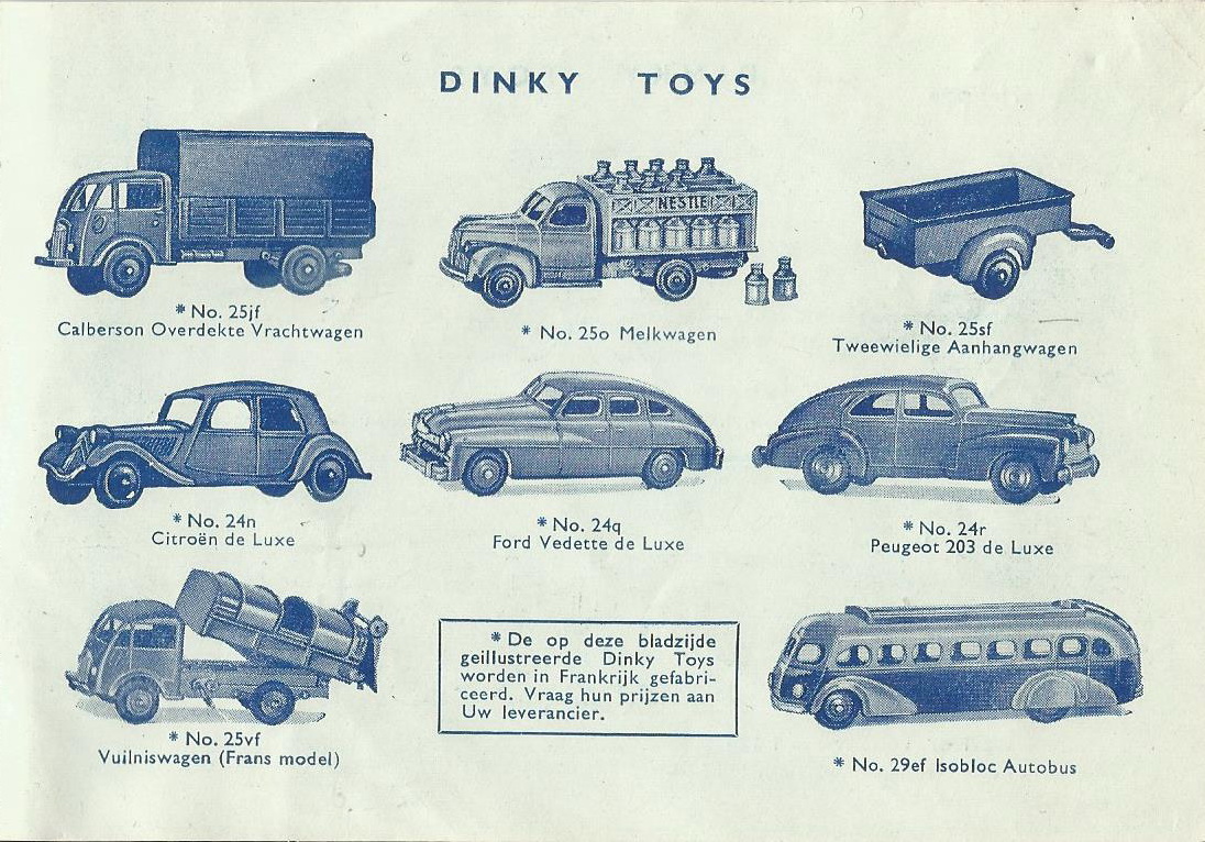 1954 Dinky Toys additional leaflet USA with French 25o I have lived between two farms in the North of The Netherlands and that's the reason why I collect most farm-related models. I always try to get the first edition of a model and did not want to buy a reproduction of Atlas editions, although these are much cheaper. According to Roulet my French 25o model must be a first edition. It was issued with a unique red cardboard luxury box in French style in which you can store the car like a garage. On the lid is a unique triangular label with the model number of Dinky Toys Meccano.
