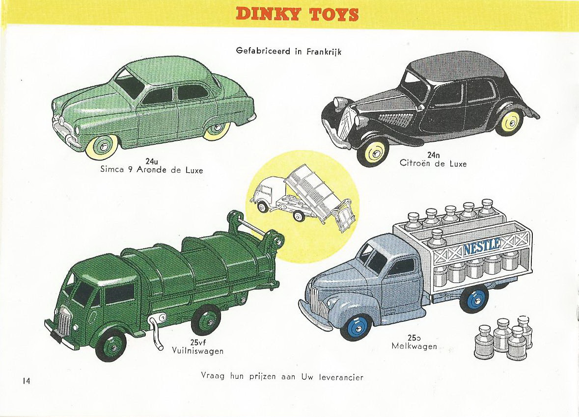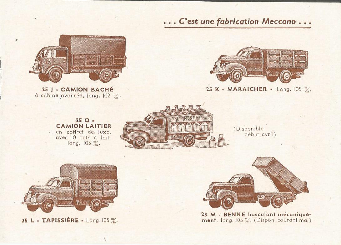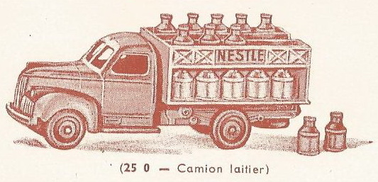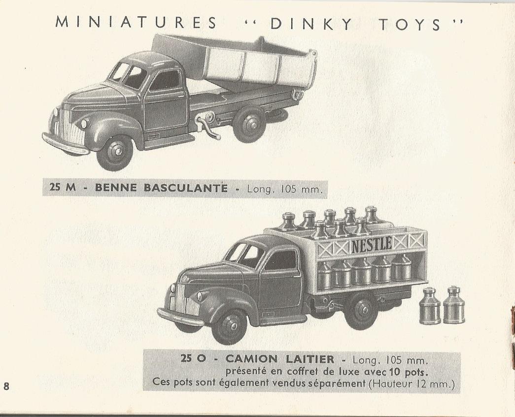 1950 French Dinky Toys catalogue with coffretde luxe25o Camion Laitier This early model was issued april 1949 with black painted total metal wheels !!! and the gap on the left side before the crank of a tipper was in this early version closed with a plate !!! (Just visable on the pictures of the 1949 French and 1951 Dutch Dinky Toys catalogue).