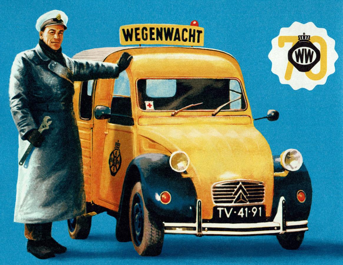 Hi Jacques, a quick translation: Besides the well-known Wegenwacht motor-cycle combinations a number of Wegenwacht 2CV cars do patrol work as well. These bright yellow ugly ducks have a bigger selection of tools, spare parts, first aid attributes etc. at their disposal, and are an important addition to the W.W. system. Lelijke Eend (Ugly Duck) is the Dutch nick name for the 2cv,, called Bestel Eend (Duck Van) is case of a van like this. Kind regards, Jan