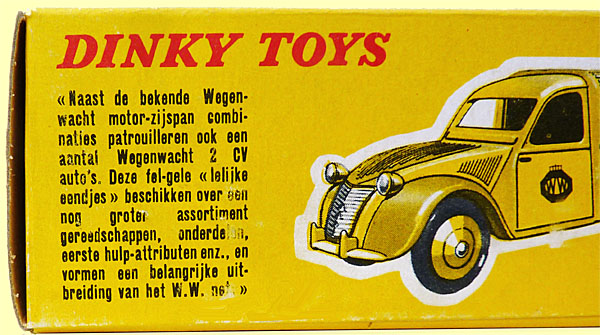 I have been doing some work on this model which does not match the real vehicle.The Dinky Toys is a Citron 2cv type AZU but the ANWB never owned any of these vans. The model which they had was the 3cv type AK350.