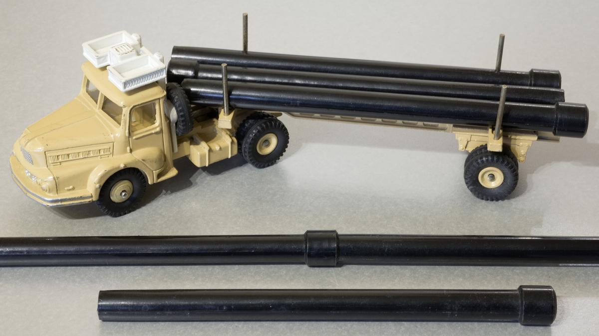 Hello Dave I am glad someone else has noticed the apparent 'lack of signing in' by many, except for one bloke by the name of 'dinkinius'! While I was in China and using my mini iPad, a strange thing happened. Although I signed out, I found when I reopened the website that I was still signed in. When I had finished, I again signed out, and the same thing happened, so I just left it with me being signed in for the next 16 days! I noticed then that frequently I was the only member on-line except during the last few days, my good mate Terry 'dinkyfan' would be keeping me company! But in the main, I was the only one, although the time difference may account for all those in Europe still in the land of nod! Having written all that, I have noticed the marked difference with those members signing in on this site as against the old site. Far more with the old site. Although those who administer this site may have access to details of which ordinary members are not privy and may very well disagree. Returning to the Unic Saharien and its pipes, the style of pipe used was aimed at the play value rather than the type of pipe the real vehicle would have carried. Normal oil pipes do not have a coupling sleeve but are in fact 'downhill welded' using a system whereby the two pipes are clamped and sealed completely by two welders working on either side of the pipe. The join is then machine tested before moving onto the next pipe to be attached. Thus the drawing on the early catalogues shows the correct pipes that would have been carried by the Unic trucks perhaps based on oil recovery in Algeria. Then, perhaps even before the model was released, the play-value came into 'play' and the type of plastic pipe changed, although one wonders why this did not follow through with the numerous catalogues etc. Kind regards Bruce (150) 20160605/931/2007