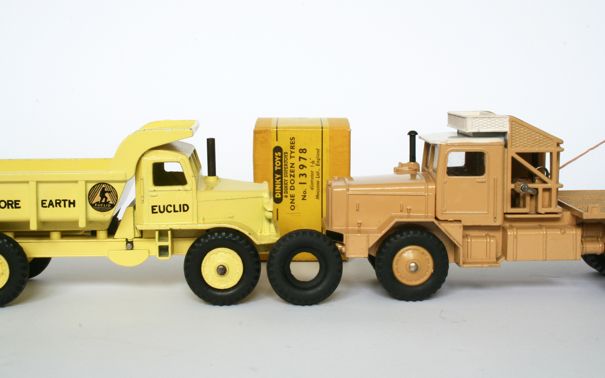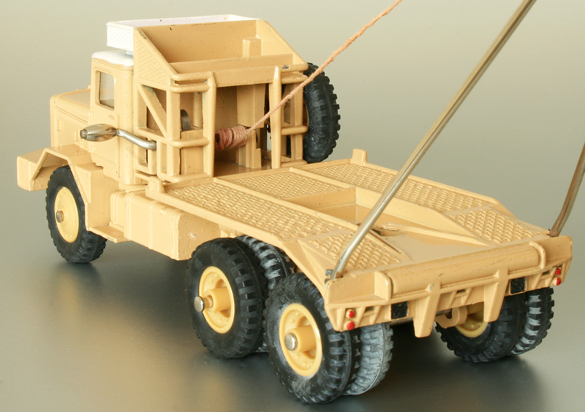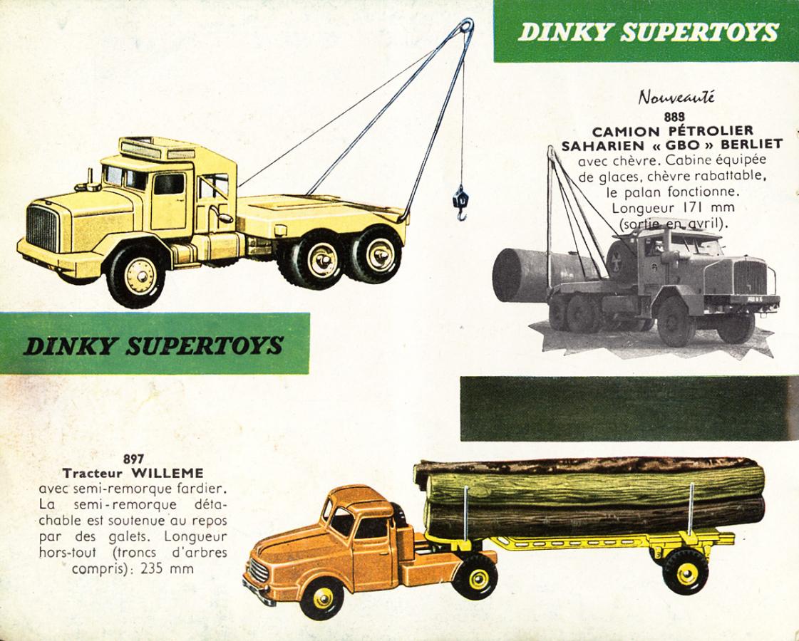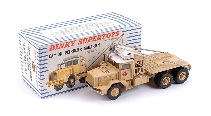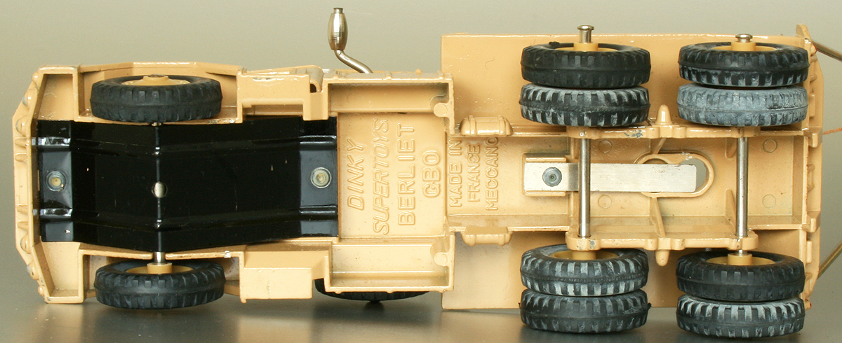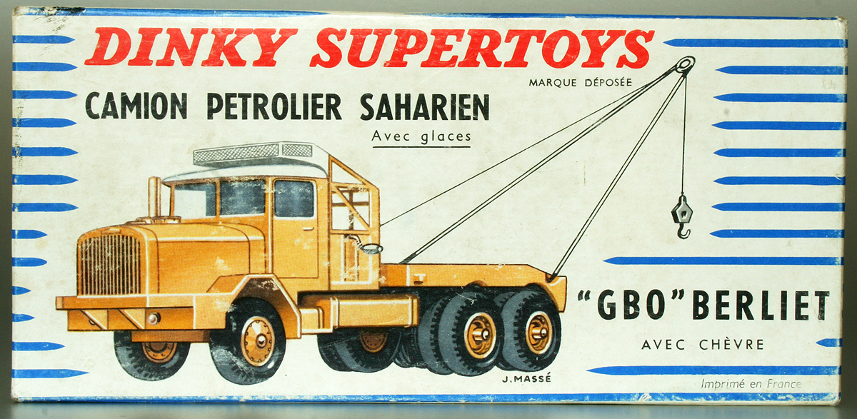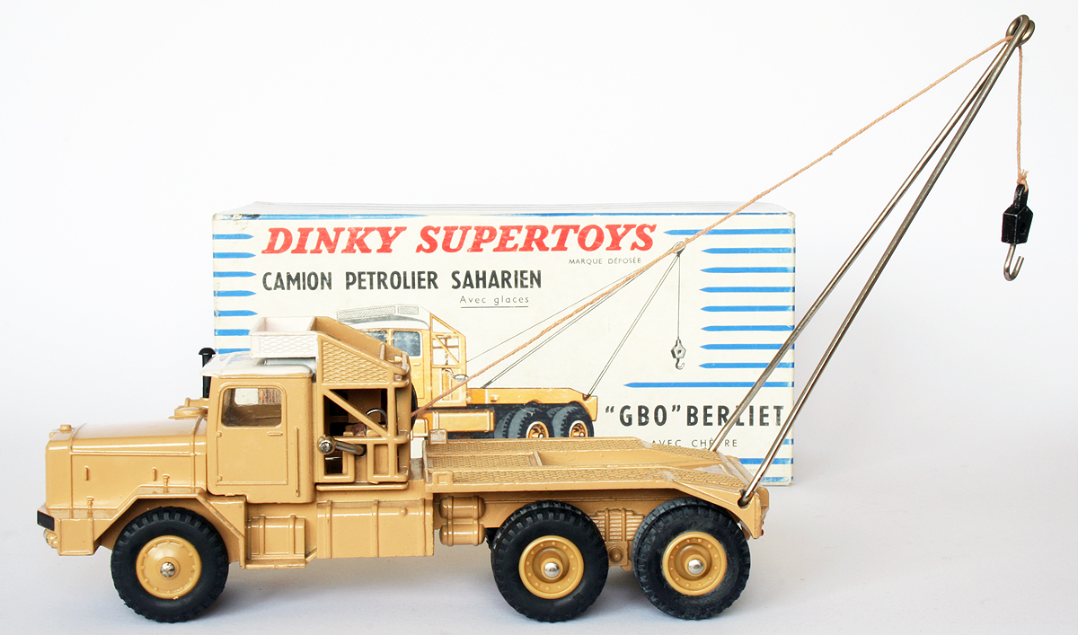 This impressive model was issued by the French Meccano business in Bobigny in 1960, subsequent to the one year earlier issued counterpart, no. 39a/893 Tracteur Unic saharien et semi-remorque porte-tubes, the Unic articulated tubes transport truck. As proportions is concerned there is some similarity with the English no. 965 Rear Dump Truck. The Camion ptrolier saharien GBO Berliet is best known with plastic hubs, a first. Some reference works, however, mention early examples with diecast wheels. The extra large 27 mm tyres were a first too, that is, for the French. Later, in 1963, the large scale articulated Unic trucks, nos. 803 en 887 (Unic MZ 125T Esterel) were fitted with these tyres as well. As the French had no (spare) tyres of this size in their programme, they possibly obtained them from the Liverpool factory. The English were familiar with these tyres since the introduction of the Euclid in 1955 and the slightly later 7.2 Howit-zer, no. 693. Moreover, they were available as spare tyres no. 13978 since 1956 already (but not in France). Despite the complicated shape this Dinky Supertoy consists of very few, two, component castings. The combination of the rear platform, chassis and front and, rivetted on that, the unit of the cabin together with the complicated roof installation plus the winch house surround. This model has always been fitted with plastic windows, a standard feature from ca. 1960 on. Suspension, however, is seen on commercials not earlier than one year later. It was fitted as a first on the Berliet GAK bach, no. 584. The crane jib is executed rather tiny and simple, consisting of one piece of thick shiny wire, which makes a loop on top, forming the hole which allows the hoisting cord to pass through. Although the looks is rather clumsy, in reality it wasnt more than a thin but no doubt sturdy tubes construction either. When erected it is secured in that position by a special hole with notch on both sides at the far rear, in which the legs are resting. By pulling them outward the jib can be folded down forward, which enables the model to fit in its box. The beige cord is fitted with a hook of the slightly smaller French type. Like the French no. 39A/893 Unic tracteur saharien et semi-remorque porte tubes, the articulated tubes truck, the cabin roof is painted matt white, the airconditioning installation on top included. The winch house behind the cabin, has an open construction, probably not the easiest part for the tool makers to realize. The hoisting handle is positioned on the left, the spare wheel is fixed on the opposite side. The platform on the rear has a realistic, detailed non-skid surface. In the centre there is a hole with a flexible lug underneath, once meant to have allowed the possible coupling with a semi-trailer. In the course of its production period this lug was removed, unused. The real Berliet truck, however, did have the function of receiving a semi-trailer, in particular serving as an articulated tanker. See i.a. the YouTube link added below. Basically the model was always in sand colour, albeit in slightly different shades every now and then. The plastic hubs may also have a shade of cream. A code 2 model is the Berliet GBO Languedocienne, finished with specific transfers on the cabin doors and the bonnet. A black sticker covers the box lids side, showing a dedicated text and containing a small visiting card of that oil business. The official name, as stated on the box is: Camion ptrolier saharien Langedocienne quipement O.F.B. (Oil Field Body). This rare livery is better known nowadays by the modern re-issue of Norev/CIJ. The blue striped box should contain a packing piece in which the six wheels find their places. Moreover, a sheet of paper with instructions should be present. As said, in the course of time a second version of this model appears, with the lug below the coupling hole removed. In 1970 en 1971 there is a short revival of this model, now as a heavy duty tipping wagon, for which the die has been adapted on some places. It is the no. 572 G.B.O. Berliet avec Benne carrire basculante, in red with a yellow all-plastic tipping body. An image of the real-world Berliet GBO 15 6x6 of 1958 is printed next to the model in the French 1960 Dinky Toys catalogue, page 8. It was developed for the special heavy duty work in the Sahara desert, in the years around 1960, when the French were very active in exploring oil fields in the North of Africa, Algeria. The six cylinder 300 hp diesel engine had a capacity of 15.000 cc and managed to haul a load of 40 tons with a speed of 40 km/h. As an articulated tanker with Coder tank semi-trailer it had a capacity of 40.000 liters. Disembarking a Berliet destined for use in the Sahara: