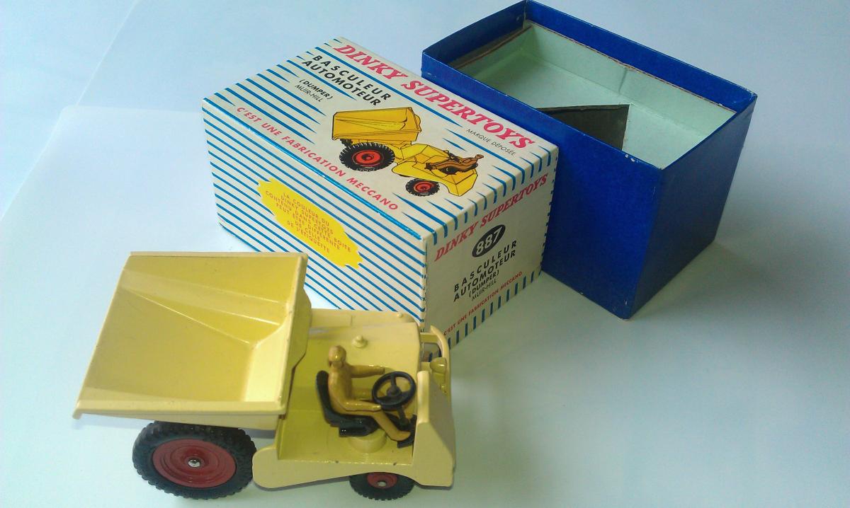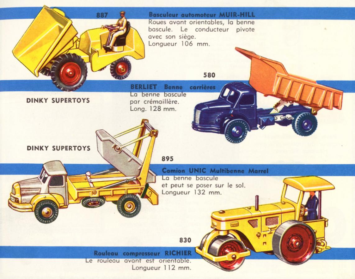 My previous model of this French assembly dumper truck was packed in a British box, as demonstrated above. I finally decided to replace it by an example in the correct French box. It arrived today, from Paris, its original place of assembly sixty years ago. It is a really superb example, virtually mint with the tyres having the same familiar rubber smell as when opening the box 'in the old days'. Even the box is as new, sturdy, without damage. My previous example was equally nice, but the painted surface was quite 'gritty' on many places and this one's is perfectly smooth. Its official availability was quite short. Roulet states 1959-1960 but the 1961 French catalogue shows the same French assembly, no. 887 still. Lateron the French returned to importing the British 962, in the original British box but with a suffix 'L' in the catalogue reference. I added a picture of the actual models to the 1961 catalogue page. As scales is concerned they are completely incompatible, as the dumper has the 1/35 scale, whereas the other commercials are 1/55 and the roller is 1/43. Kind regards, Jan