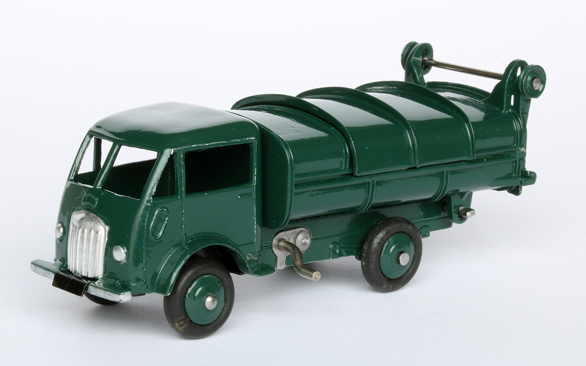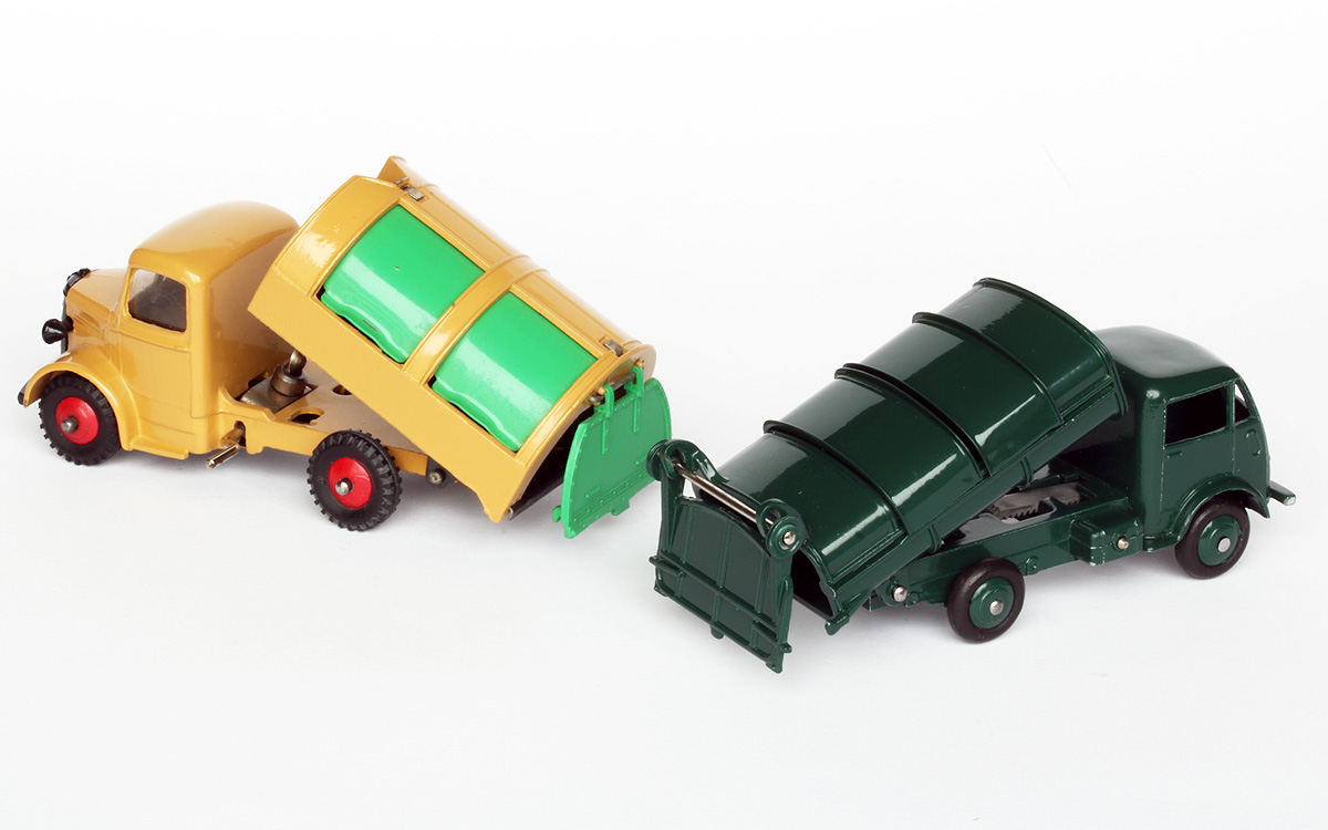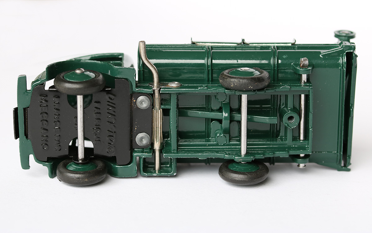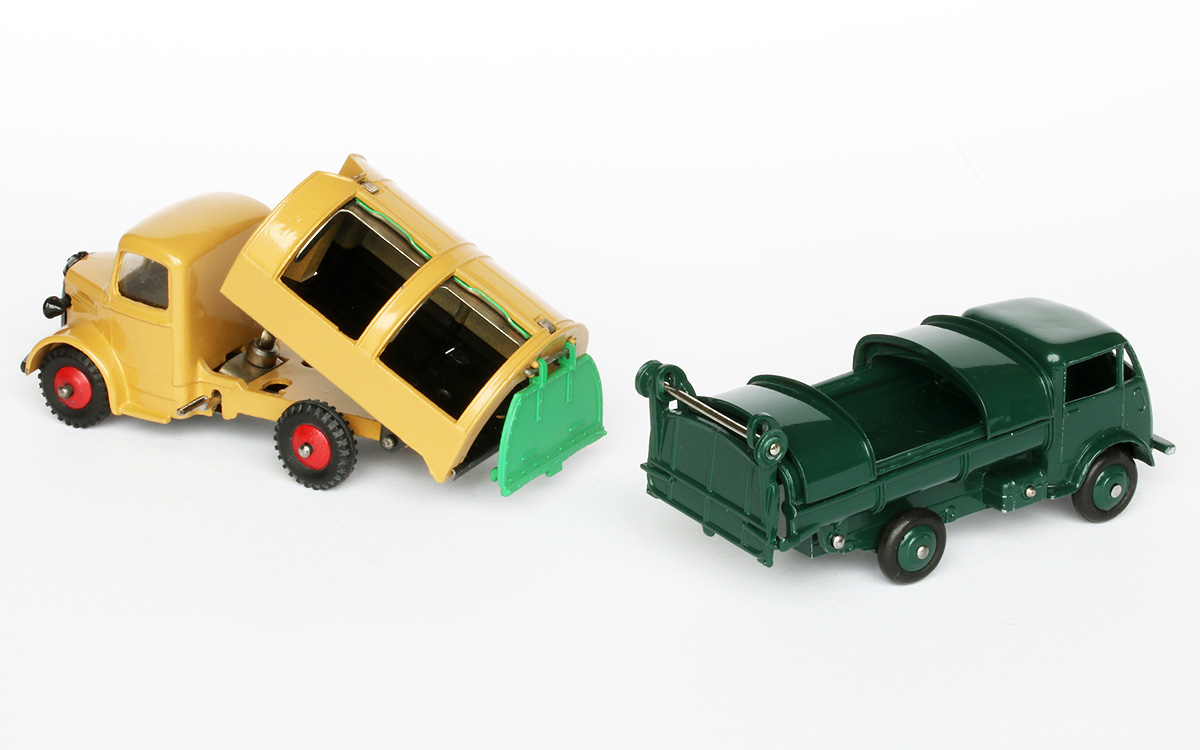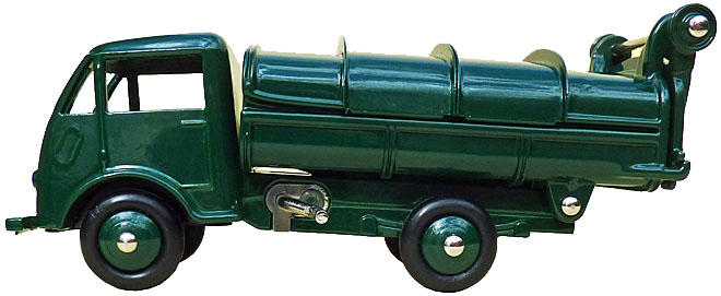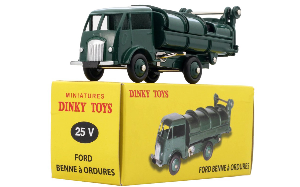 The French Ford garbage truck was introduced in October 1950 (Gardiner & ONeill) or January 1951 (Roulet). In 1954 it was introduced in the USA and included in the US 1955 catalog for the last time. The French catalogues say: 'Bascule mchaniquement, les panneaux glissent, la porte arrire s'ouvre' (tipping mechanically, sliding covers, opening tailgate). Many moving parts indeed for such a small scale model. The tilting garbage container is provided with two movable, tinplate sliders in the centre, and at the rear it has a hinged tailgate, which needs a lifting movement before opening. The tipping mechanism works via a gear rack, which can be moved to the front and to the back with a rotating handle on the left. That rack is clearly visible at the front of the cab, looking through the cab windows, when it is in a rest position. It pushes the garbage container upwards, when moved backwards with the handle. Only the first variant of 1950 has lighter green wheels than the rest of the model. Initially everything is still smooth: the insides of the cab roof and the dirt container, and so is the inside surface of the tailgate. Everything according to Roulet. Variant two is completely dark green, wheels included. Also, the inside sides of the roof and garbage container are still smooth, except that of the tailgate, which has a flat cross added below. In 1951, the sliding guides at the front (or base of the immobile front cover?) are still straight, flush, but in 1952 this second variant shows 'open', upwardly bent guides / cover bases at the front. The third variant, of 1953, still has the 'open', upward pointing sliding guides, but the interior of the roof now has a criss-cross pattern. The fourth variant remains largely unchanged: the cross still exists on the inside of the tailgate, but now the inside of the container, on top, at the front, features a moulded tiny stripes pattern. Depending of the definition of a variant, Roulet keeps open the possibility that there are more intermediate combination variants, which is apparent from the fact that Redempt and Wagner (Sries 25 et 500 Camions, fourgons, camionnettes, autocars, autobus, series des militaries) list five variants. As usual for this period, the model was only sold from grey retail boxes, containing half a dozen models. The English counterpart is the slightly older (Bedford) Refuse Wagon, in the parallel English series 25, and also numbered 25v (in 1954 renumbered 252). In the Dutch catalog of 1953 both garbage trucks are included, the English one under no. 25v, the French under the temporarily adjusted number 25vf! The same goes for the 1955 US catalogue, where the French one is designated an F and asterisk: F25v*. By the way, contrary to the English models the French models in the Dutch contemporary catalogues do not have fixed retail prices. The relevant pages refer to the individual retailers, without mentioning any price. The over 10% difference in scale (1:48 versus 1:55) makes a difference in the volumes of both models, the British one looking more robust than the tiny, more intricate looking French truck. Although the British Bedford cab had various adoptions, the French Ford undisputedly surpassed that number. However different they may be, there is understandably also a great deal of analogy in the construction of and material used for both models: the tipping mechanism, the tinplate shutters and the hinged, downward tilting tailgate. Compared to the English counterpart, the French garbage truck had a remarkably short life, 17/18 years versus 4/5 years. Since Atlas issued a replica of this model, it is not easy to find a real Dinky Toy between all these recent counterfeits. Apart from the mirror-smooth casting and the immaculate lacquer finish, the replica can always be unmasked by the presence of an individual box (which the original never had) combined with the always 'open', obliquely upward pointing immobile front cover (and sometimes even a notable crack in the chassis). Though still rather hard to find in immaculate condition, no doubt influenced by the availability of the very cheap Atlas issue, the price of an original is quite modest nowadays, mine having cost only slightly more than some of the most expensive Atlas examples offered recently. As always, comments, additions and corrections welcome! Kind regards, Jan