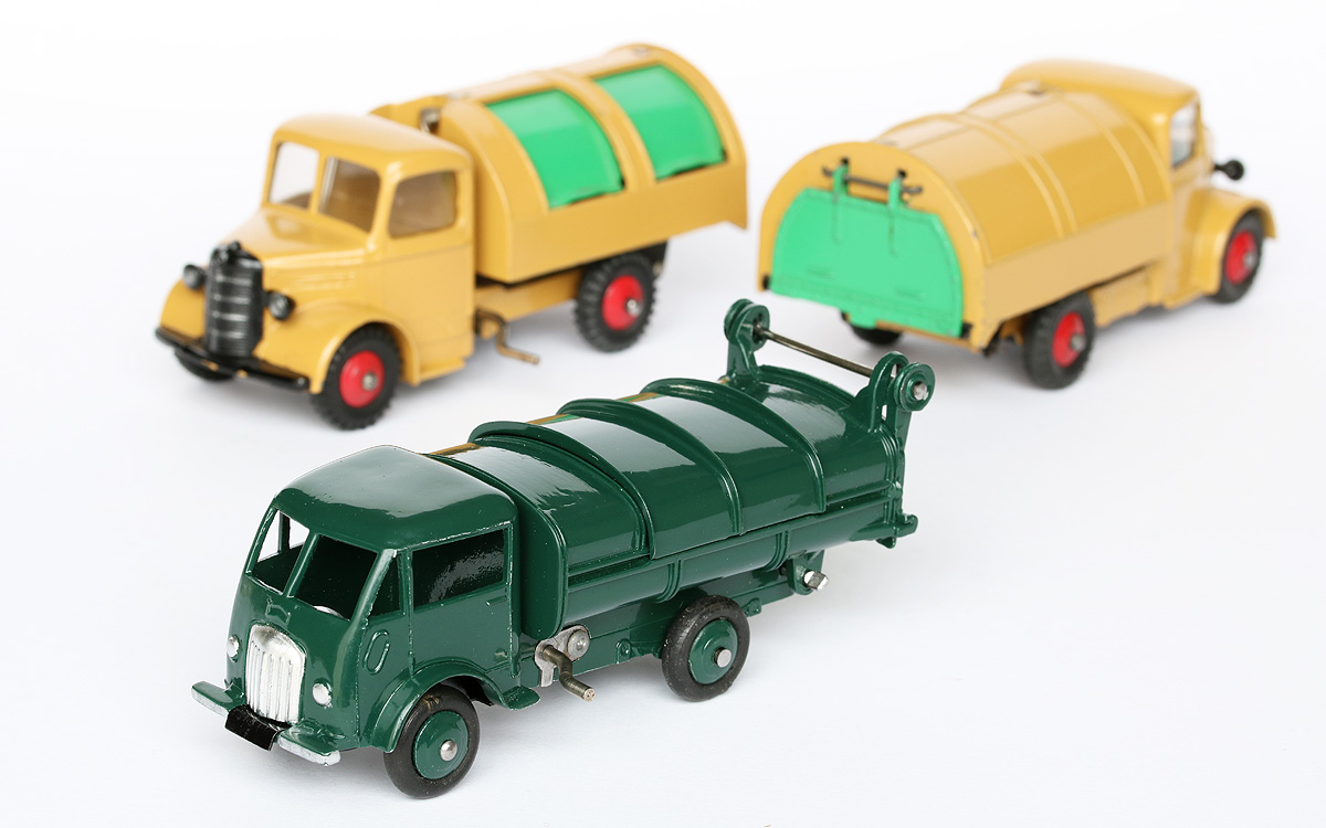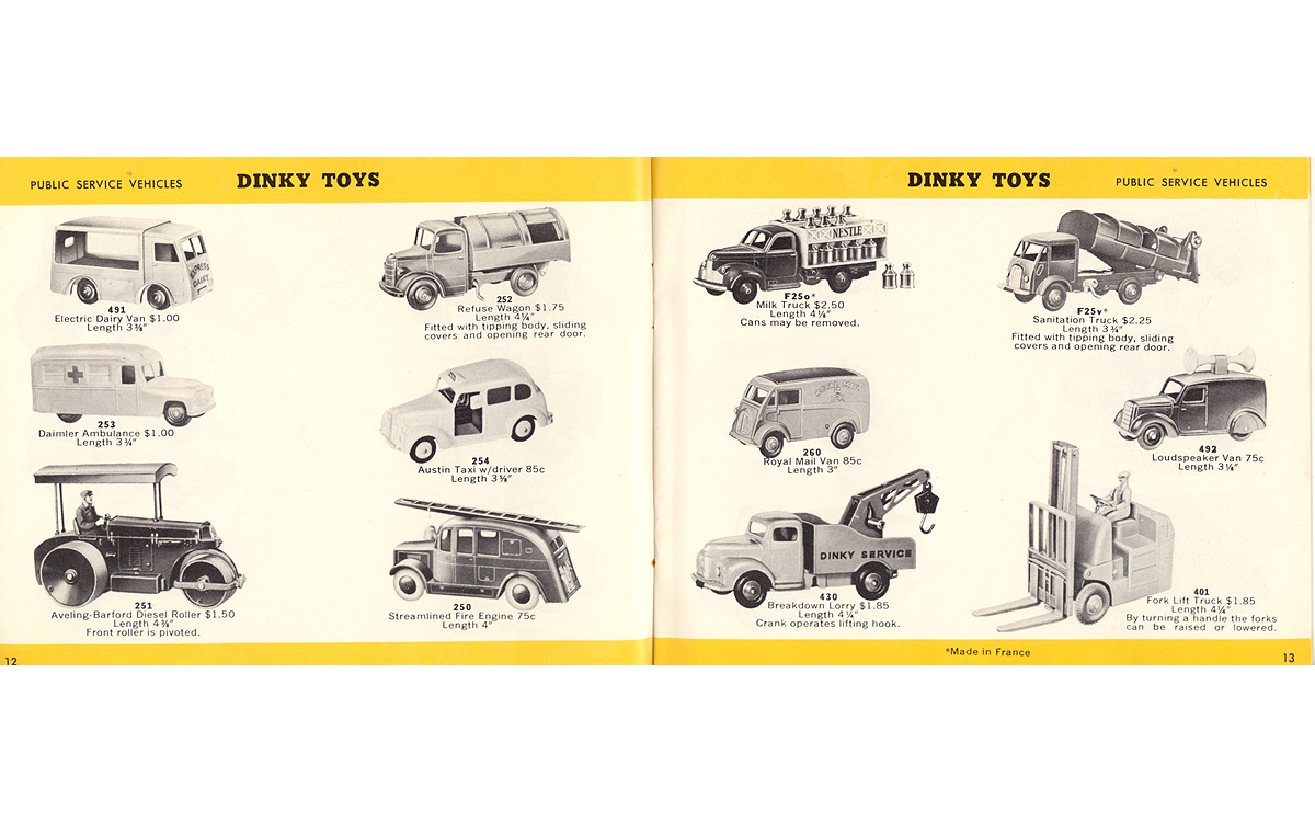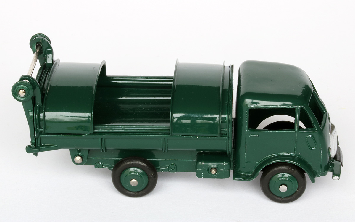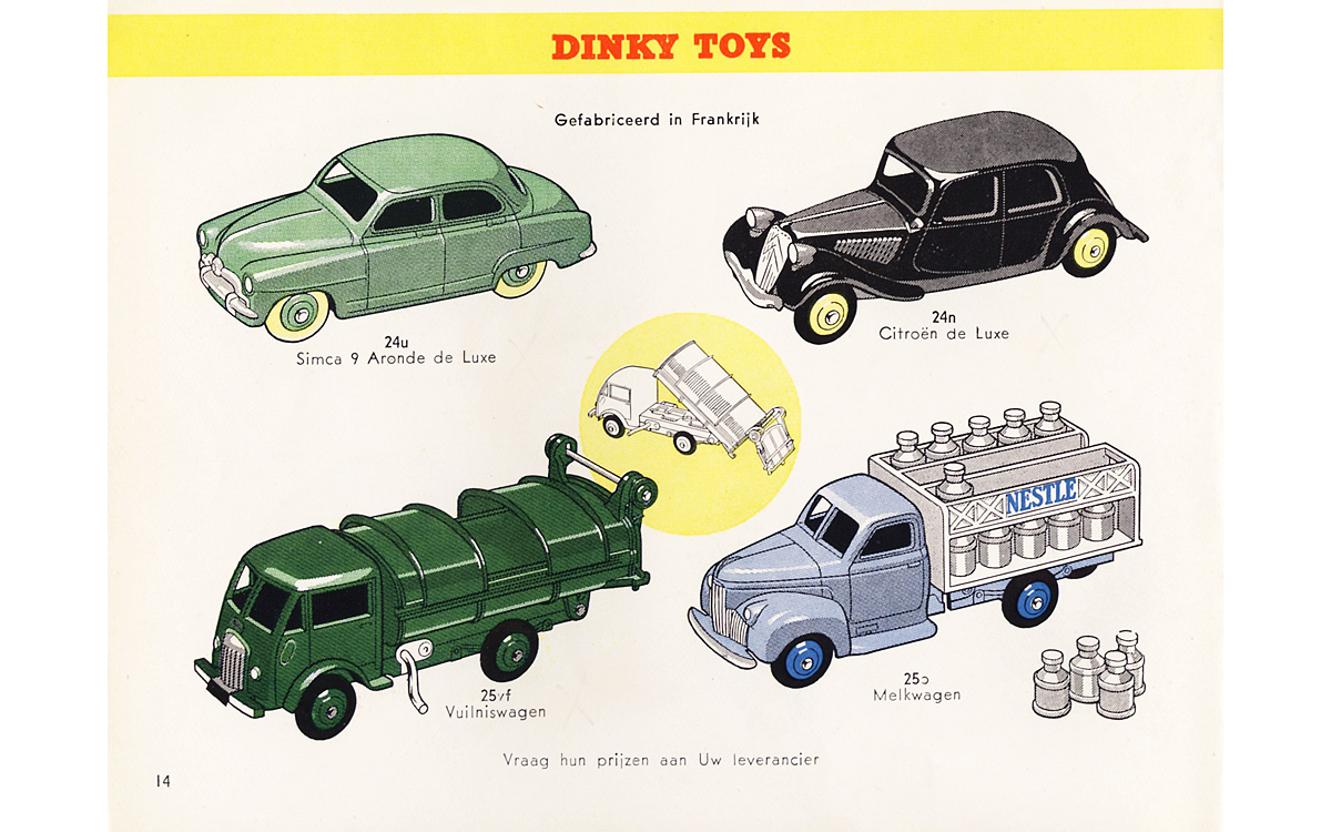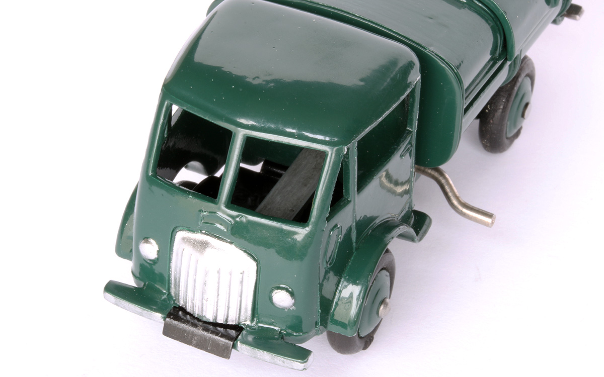 The French Ford garbage truck was introduced in October 1950 (Gardiner & ONeill) or January 1951 (Roulet). In 1954 it was introduced in the USA and included in the US 1955 catalog for the last time. The French catalogues say: 'Bascule mchaniquement, les panneaux glissent, la porte arrire s'ouvre' (tipping mechanically, sliding covers, opening tailgate). Many moving parts indeed for such a small scale model. The tilting garbage container is provided with two movable, tinplate sliders in the centre, and at the rear it has a hinged tailgate, which needs a lifting movement before opening. The tipping mechanism works via a gear rack, which can be moved to the front and to the back with a rotating handle on the left. That rack is clearly visible at the front of the cab, looking through the cab windows, when it is in a rest position. It pushes the garbage container upwards, when moved backwards with the handle. Only the first variant of 1950 has lighter green wheels than the rest of the model. Initially everything is still smooth: the insides of the cab roof and the dirt container, and so is the inside surface of the tailgate. Everything according to Roulet. Variant two is completely dark green, wheels included. Also, the inside sides of the roof and garbage container are still smooth, except that of the tailgate, which has a flat cross added below. In 1951, the sliding guides at the front (or base of the immobile front cover?) are still straight, flush, but in 1952 this second variant shows 'open', upwardly bent guides / cover bases at the front. The third variant, of 1953, still has the 'open', upward pointing sliding guides, but the interior of the roof now has a criss-cross pattern. The fourth variant remains largely unchanged: the cross still exists on the inside of the tailgate, but now the inside of the container, on top, at the front, features a moulded tiny stripes pattern. Depending of the definition of a variant, Roulet keeps open the possibility that there are more intermediate combination variants, which is apparent from the fact that Redempt and Wagner (Sries 25 et 500 Camions, fourgons, camionnettes, autocars, autobus, series des militaries) list five variants. As usual for this period, the model was only sold from grey retail boxes, containing half a dozen models. The English counterpart is the slightly older (Bedford) Refuse Wagon, in the parallel English series 25, and also numbered 25v (in 1954 renumbered 252). In the Dutch catalog of 1953 both garbage trucks are included, the English one under no. 25v, the French under the temporarily adjusted number 25vf! The same goes for the 1955 US catalogue, where the French one is designated an F and asterisk: F25v*. By the way, contrary to the English models the French models in the Dutch contemporary catalogues do not have fixed retail prices. The relevant pages refer to the individual retailers, without mentioning any price. The over 10% difference in scale (1:48 versus 1:55) makes a difference in the volumes of both models, the British one looking more robust than the tiny, more intricate looking French truck. Although the British Bedford cab had various adoptions, the French Ford undisputedly surpassed that number. However different they may be, there is understandably also a great deal of analogy in the construction of and material used for both models: the tipping mechanism, the tinplate shutters and the hinged, downward tilting tailgate. Compared to the English counterpart, the French garbage truck had a remarkably short life, 17/18 years versus 4/5 years. Since Atlas issued a replica of this model, it is not easy to find a real Dinky Toy between all these recent counterfeits. Apart from the mirror-smooth casting and the immaculate lacquer finish, the replica can always be unmasked by the presence of an individual box (which the original never had) combined with the always 'open', obliquely upward pointing immobile front cover (and sometimes even a notable crack in the chassis). Though still rather hard to find in immaculate condition, no doubt influenced by the availability of the very cheap Atlas issue, the price of an original is quite modest nowadays, mine having cost only slightly more than some of the most expensive Atlas examples offered recently. As always, comments, additions and corrections welcome! Kind regards, Jan