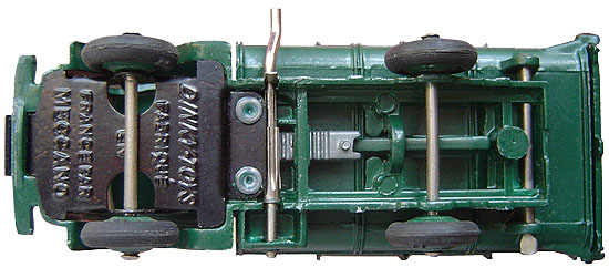 May I add to Jan's excellemt article ?The Ford Poissy benne ordures was first advertised on page 8 of the French 1950 Dinky Toys catalogue as 'nouveaut' to be available from October. It was last seen in the 1954 catalogue and in the June 1954 Meccano Magazine after a life span of only four years. It was the last of the Ford's to be produced.Reduced to the size of 1 / 68 there were indeed five variations as follows :1) Chassis type 1 or 2 ? with smooth cab ceiling, closed grooves, smooth tipper, no cross on the tail board, light green then from 1951 onward dark green. 2) As above but with type 3 chassis. 3) As above but with cross on the tail gate, smooth cab ceiling, the grooves are open at the front. 4) As above but with checkered cab ceiling. 5) As above but with checkered cab ceiling, the bottom of the tipper is grooved. see picture below