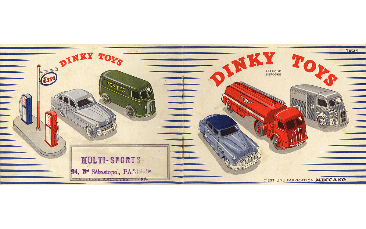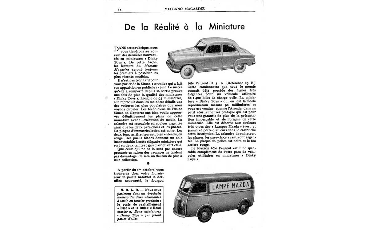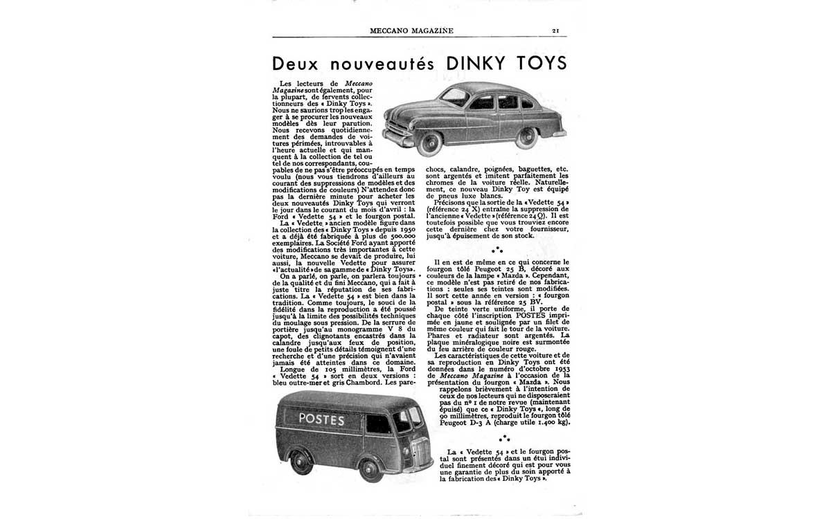 The first version of this Peugeot van was a yellow-green commercial van, no. 25b, with the advertising Lampe Mazda, dating from September 1953. The scale is rather unusual 1/50, as confirmed by the factory assembly drawing 100.318 of 19 April 1951. The mock-up, the wooden proof model, which is still in existence, is on the 1/43 scale according to Roulet. The dark green colour of the mail van is in accordance with the actual colour of the French postal service in the nineteenfifties and sixties. This dark shade of green is very often found on other French Dinky Toys from that period. All around, in the middle, except for the front, a yellow-coloured strip is applied. The Fourgon postal is a very common model that shows up in various subtle variants in the second half of the 1950s. The earliest version can be recognized by a smooth inside of the roof. The name POSTES is stamped by tampoo printing in the slimmest letters of all variants. At that time, the tyres always showed an M in relief. The second one has the same characteristics, but it has a checkered inside of the roof. The third type has a somewhat rounder O, while the lettering has now been applied by means of a transfer. The fourth version shows a text of which the O shows more or less straight sides. In the fifth and final state the O has become rounder once more, and the characters are bolder than before. The transparency and shade of yellow can vary, so that strictly speaking even more variations could be distinguished. We only find this latter variation with the newly introduced concave hubs, the model packed in a dual numbered box 25BV / 560. From the outset, the model has been packed in an individual yellow illustrated end flaps box. Atlas produced a replica of this final variant, probably the least common one. This mail van of April 1954 is based on a Peugeot D.3.A. van. These vehicles were initially sold by Chenard & Walker (1946-1950). They were in need of a suitable engine, to be supplied by Peugeot, whereas Peugeot had not been able to develop a new van after the war yet. So from 1950 on Peugeot continued production until 1965. The initial Peugeot 202 engine was replaced over the years by a 203 and finally a 403 engine. The bodywork was produced for Peugeot by Chausson, which firm would later be taken over by Peugeot. Characteristic is the pig's nose, the shape of which is the result of the compact, almost square, forward protruding grille and radiator. The French black and white catalogue of 1954 shows the model for the first time, even in colour on the back of the cover. As a Dinky Toy, renumbered 560, the Fourgon postal is included finally in the 1960 catalogue, but still without the contemporary concave hubs. For the French this was the first model of a postal van. The British already had one available before the war, the Royal Mail Van, no. 34b. After it was discontinued in 1952, the new Royal Mail Van, no. 260, was launched in 1955 as a contemporary counterpart to the Fourgon postal. In addition to the aforementioned Lampe Mazda version, a promotional Peugeot Service and a scarce version without advertising lettering were made. Similar models are also known in Cibi livery and even a fire engine version, all very rare, if not unique. Both the availability of the Atlas edition, and the many surviving originals, make a real Dinky Toy Fourgon postal rather easy to find and affordable. Comments, additions and corrections very welcome, as usual, kind regards, Jan