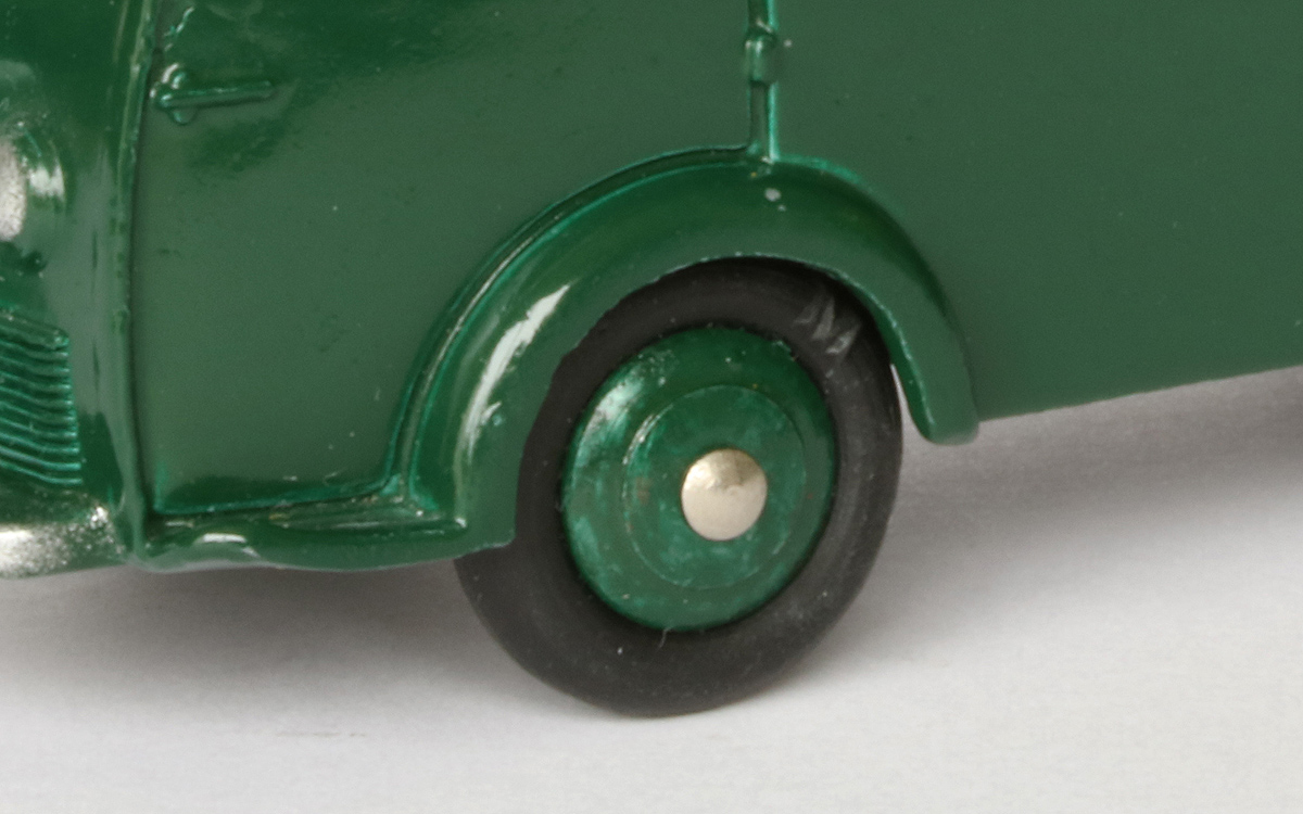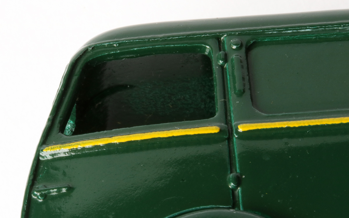 Yes Jan, one can only see the 1/3 cross hatching when the van is dismantled. About the open/closed rear windows, the flash could not be removed automaticaly because those windows are two small. The deburing is done by placing the raw castings in a rotating barrel and mixing those castings with some abrasive synthetic stones. If the stones are much larger than the windows to be debured, this does not work properly. Bobigny and LIverpool had probably a different way of doing the deburing. Deburing was certainly not finished by hands, the models with excessive flash were certainly molten again. One can not do any work by hand when one makes one million Dinky a month. I know only two cases of filing castings : some of the Panhard PL 17 on which the indicators were filled off and one can see the scratches and the laders of the 32e - Berliet fire engine. Why did Bobigny succed to keep those small windows is probably because the dies were subcontracted and of better quality than those made in house at Binns Road. The problem was raised as early as 1934 when the small side and rear windows of the type one 25d tanker were closed and it was still not solved when the Binns Road factory closed in 1979 as the Convoy trucks had filled in rear windows.