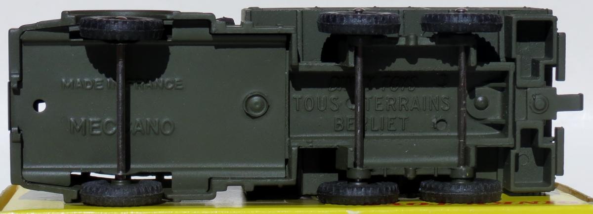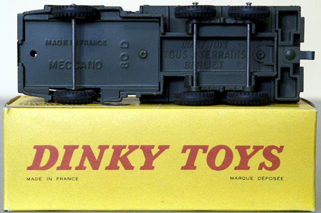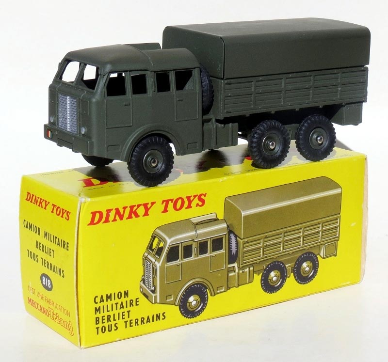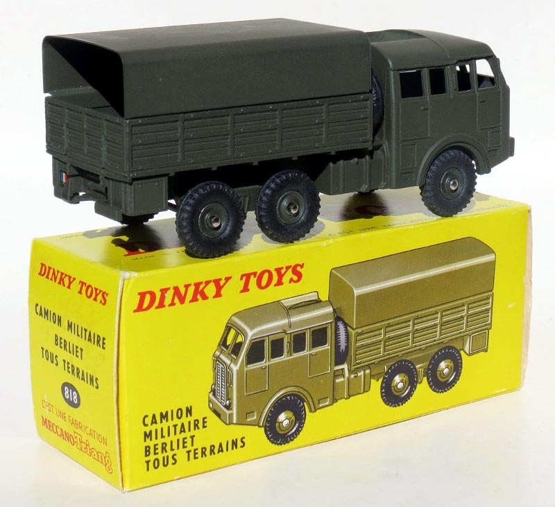 Just an ordinary, CAMION MILITAIRE BERLIET TOUS TERRAINS No.818, nothing unusual, but I was delighted with its condition as the model is totally mint with not a chip nor finger-sheen, and the box - each end flap is tight and crisp, although there is a slight corner bump! I have not been a French Dinky enthusiast until recent years, as I never saw any French Dinky Toys when growing up, nor was I aware that a French factory existed. Australia only received the English Dinky Toys as far as I am aware, although some may have arrived for distribution in the capital cities, those living out in the bush might have been forgotten. We lived 'out in the bush', which is not quite as isolated as being living out in the 'outback'!Kind regardsBruce