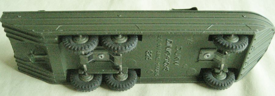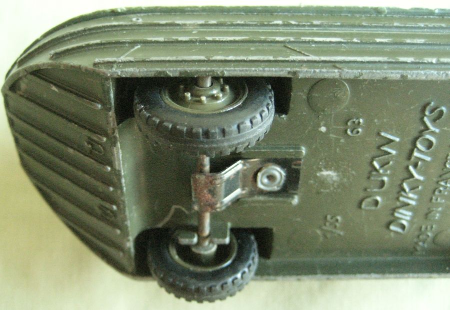 Hello Jacques, Here are some more pictures of the DUKW. It came with a driver and a set of the barrels and crates and also a good original box. The brackets at each end of the axles are painted the same as the rest of the model. The spring brackets in the middle of the axles are held onto the body with rivets which have not been disturbed, and are painted black. This is all consistent with the 2 other DUKW's that I have. Hope this answers your questions but if you need any more information let me know. Regards, Chris.