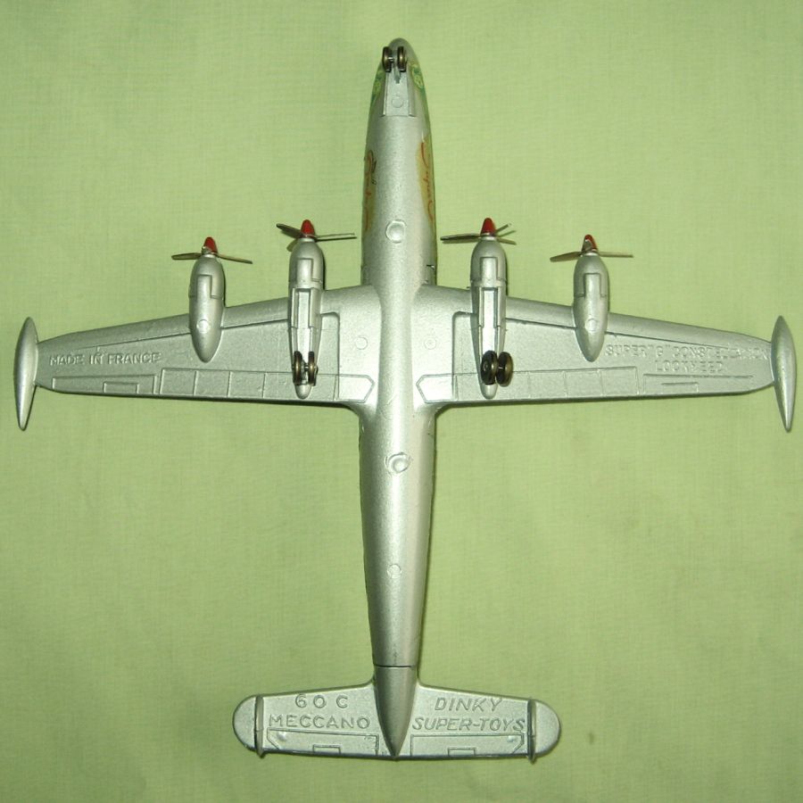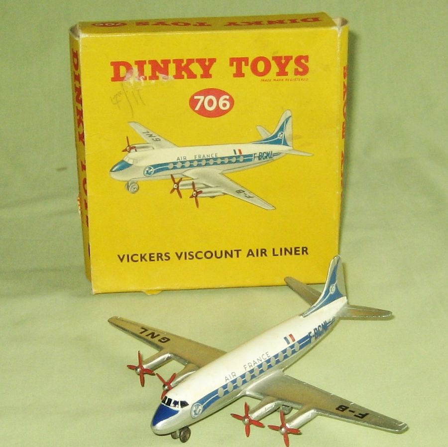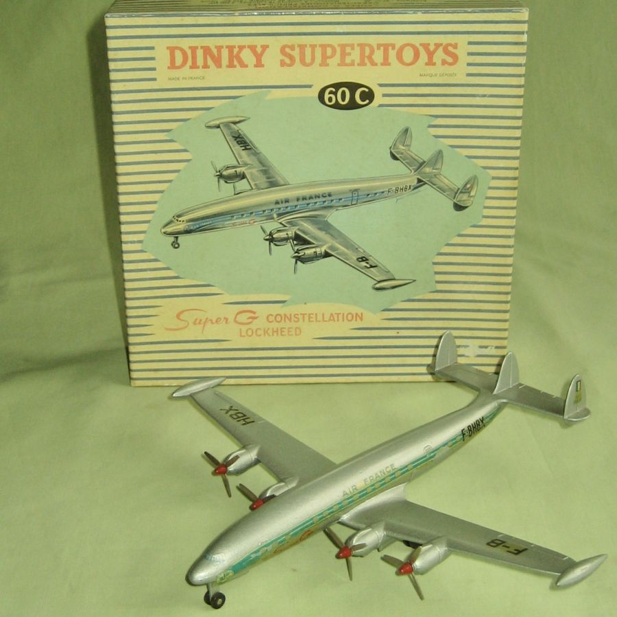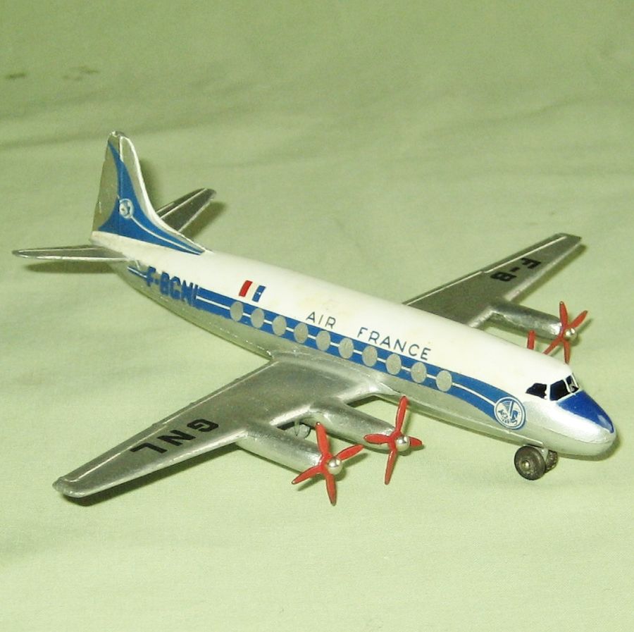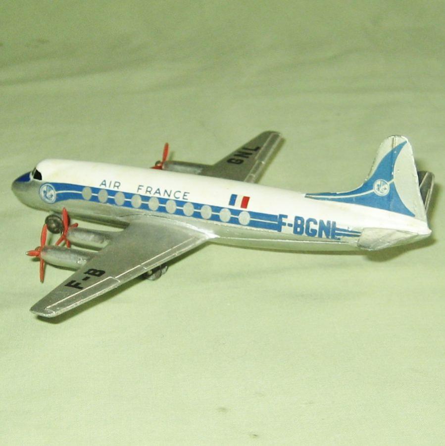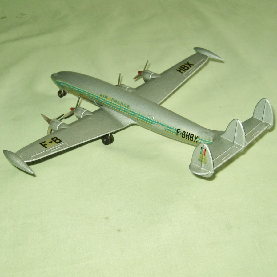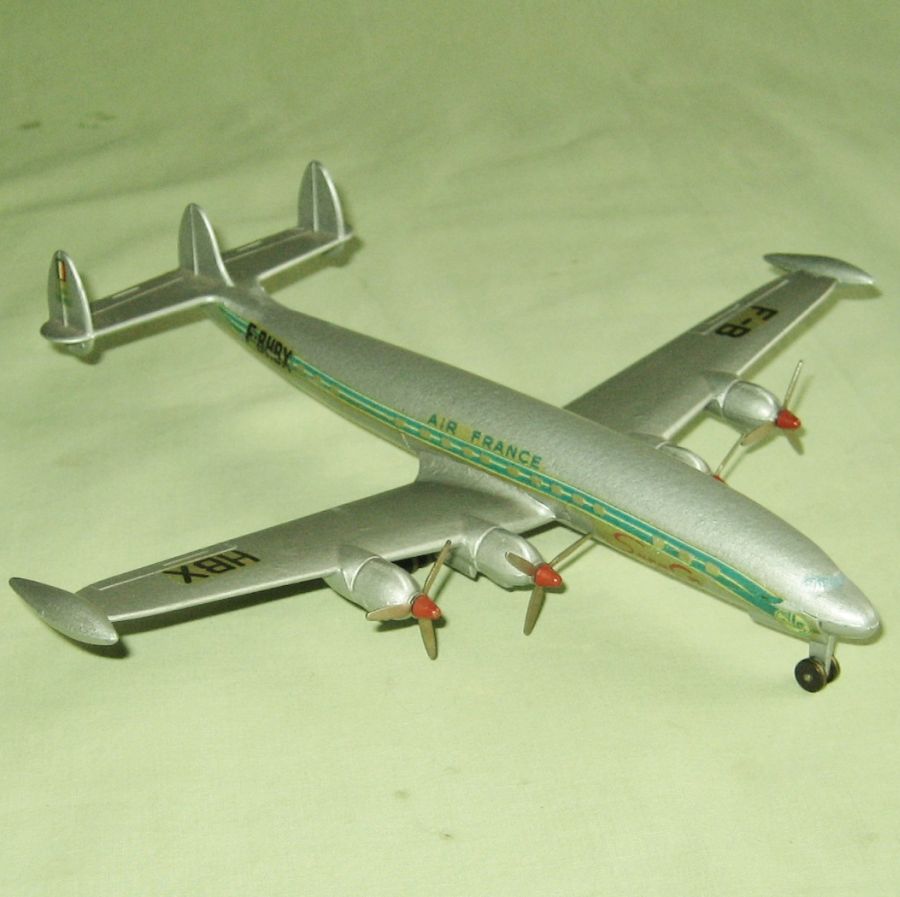 A couple of recent arrivals. Firstly the Vickers Viscount Airliner 706. This is the English version of the Air France plane with registration no. F-BGNL. It was the first version and only produced for one year from 1956 to 1957. It differs from the French version in not having landing gear doors and other minor details. Secondly the French Dinky Supertoys Super G Constellation no. 60C with Air France livery and the registration no.F-BHBX. This was made between 1956 to 1963. There were, according to Jacques Dujardins CD, Catalogue of Dinky Toys, two versions, one painted grey and one painted silver. Mine appears to be the grey version. Both planes are in extremely good condition with good boxes. Chris.