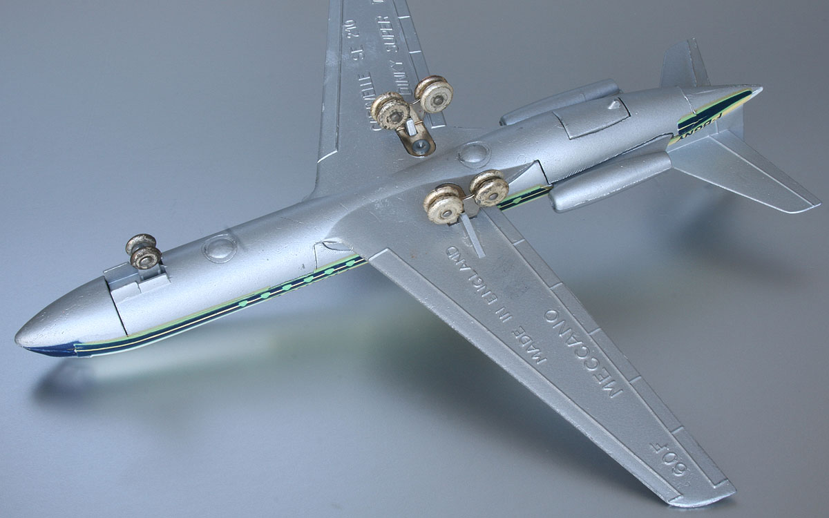 Chris, Nice buy of this jet in good condition.The triangular windows are of the right shape, this was a caracteristic of the actual CaravelleThe white wheels are peculiar, are they Dinky Dublo smooth plastic wheels or are they overpainted ?