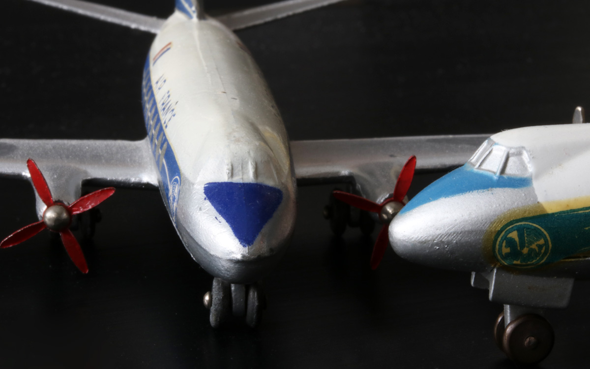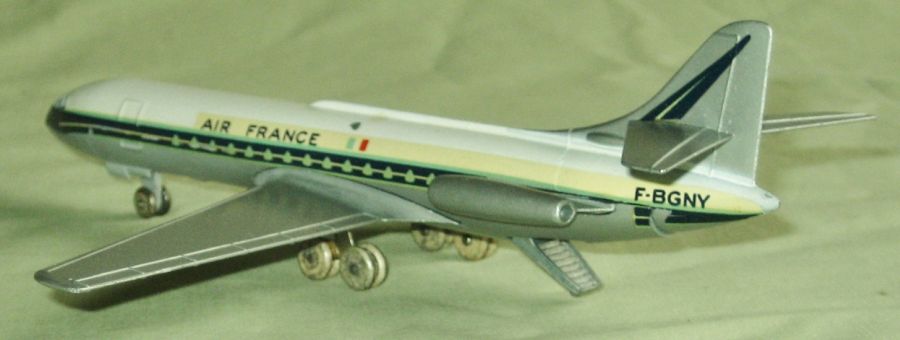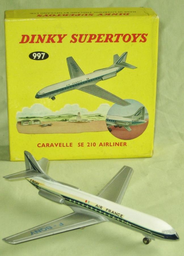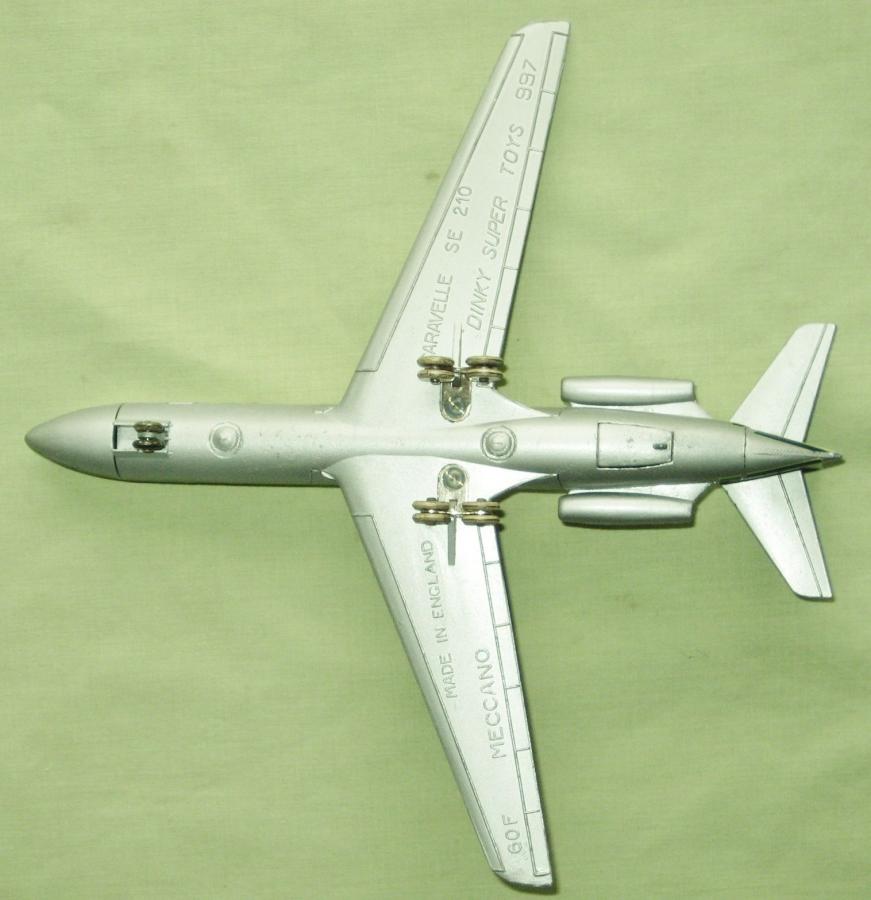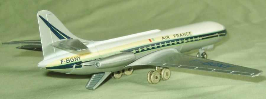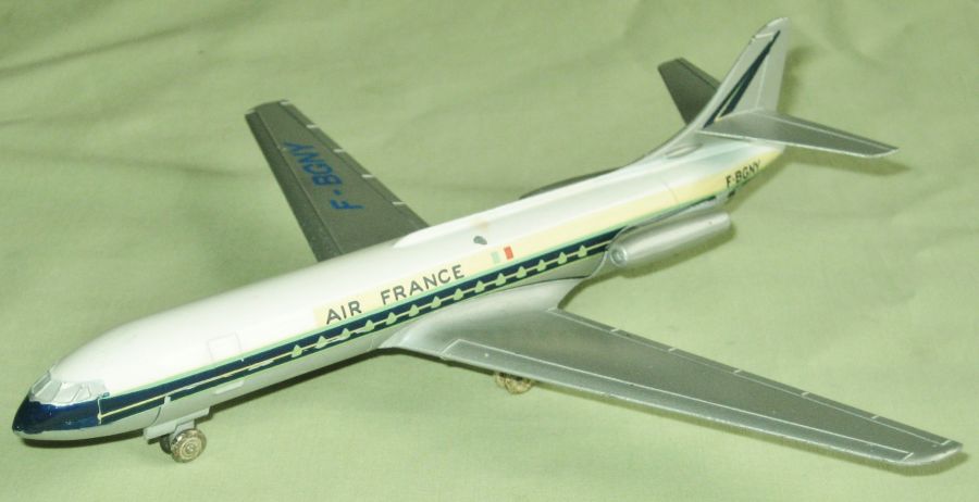 This came a few days ago - a Dinky Supertoys Air France Caravelle SE 210 Airliner. This is the English version which was made between 1962 & 1965. It has the retractable stairs under the tail and also note the words Super Toys under the wing rather than Supertoys.There are quite a few variations with different airlines featured on the fuselage - Air Algerie, Swiss Air, Scandinavian Airlines System and SAS and with different registration numbers. The die apparently went between England & France several times. Rather strangely the windows are slightly triangular rather than round. Chris.