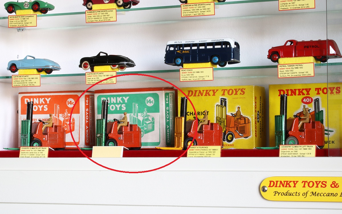 Three wonderful acquisitions this month, all within the 1945-1950 time span. An early post-war no. 34b Royal Mail Van, this one with open oval rear windows, early smooth hubs and very nice fresh white treaded tyres. Also a maroon no. 36g Taxi with Driver, although with later ridged hubs still with early open tiny rear window. And finally a no. 14c Climax Fork Lift Truck, an early production example with large black round treaded tyres and packed in a less common green labelled orange lift box. Time to produce new display labels, supports, photos and catalogue descriptions for each of them! Kind regards, Jan