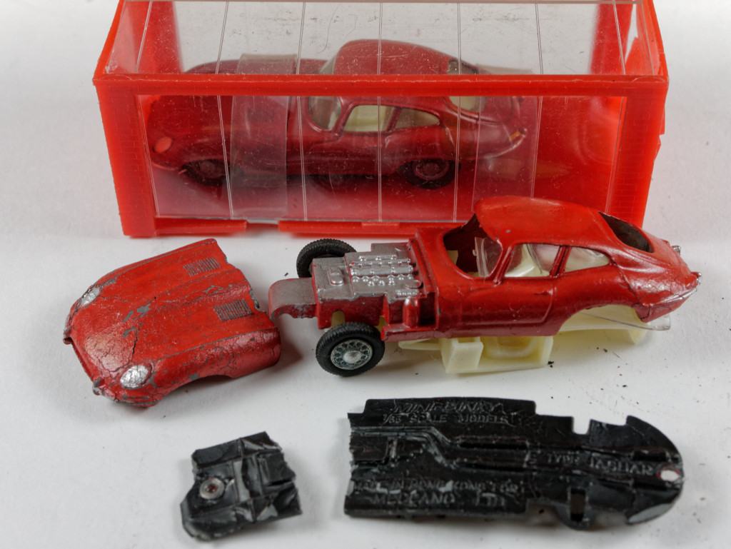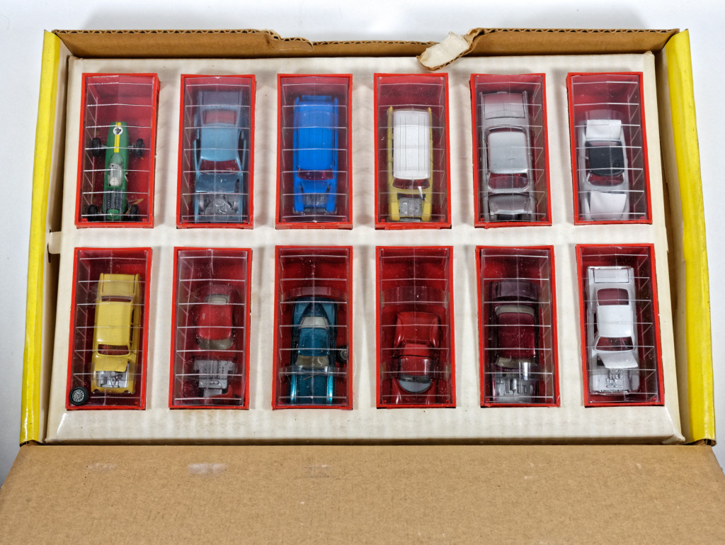 I recently received this extremely rare gift set from an eBay seller (unfortunately, the price was not $3.95). I have only ever seen two others, via searching past Vectis auctions. I imagine it is as uncommon as prewar Dinky sets, and in fact it has something in common with them, as we will see.I pose the question of whether these are the worst ever Dinky Toys, but there is also the question of whether they can be considered Dinky Toys at all. While sold by Meccano Ltd., the Mini-Dinky range was designed by Lines Brothers in Merton, London* and had nothing to do with Binns Road. While separate leaflets advertising them were published, they were never included in a Dinky catalogue as far as I know. Appearing in 1967, the Mini-Dinkys were produced in Hong Kong. The moulds were well-designed and the models came in attractive (though flimsy) plastic garages, but the paintwork was mostly drab, wheels tended to come off, and -- worst of all -- many of the castings tended to suffer from metal fatigue. This sometimes manifested itself before the toys had even left the shops, although that could be a while since the range did not sell well. How Lines Brothers thought these toys could compete with much-more-attractive-and-sturdy Matchboxes or Hot Wheels is a mystery. When the toys were 'deleted' is hard to say, given slow sales. I recall buying several Mini-Dinky models at London souvenir stands in 1972, but they may have been old stock. Meanwhile, various 1967-model cars (Rambler, Camaro, etc.) were made by Mini-Dinky in prototype form but not issued, suggesting the plug had been pulled on this range pretty quickly. As an aside, as well as passenger cars, the Mini-Dinky range also included construction vehicles, via moulds previously used by Mercury in the USA (and later to be issued under other brands), and several Formula One racers made by Best Box in Holland. Underlining Mini-Dinky's second-class status, these toys were often sold by retailers that did not have regular Dinky Toys. (Perhaps UK readers can comment on whether they ever saw Mini-Dinky and Dinky Toys together in the same shop.) I've already mentioned purchasing some of the models in a London souvenir shop. Here in California, they tantalizingly appeared in a Palo Alto hobby shop at a time when my best friend and I were unable to purchase the real Dinky Toys we wanted. Naturally we quizzed the proprietor, and she reported that her distributor had no other Dinky Toys, only these. So I purchased various samples as a curiosity, even if they were always pretty disappointing for the reasons I've mentioned. As for the present gift set, I never saw it at the time, but they obviously existed in small quantities. I believe the eBay seller when he says that the models in the set were never removed from the box. They all came strapped down in their individual garages, obviously unplayed with. And at first, all looked well -- but you can see the condition of the Jaguar E-type, which has fallen to bits from fatigue. (I have an intact one with which to 'complete' the set -- though I suspect that its original contents were a random selection from the Mini-Dinky range ... otherwise why include two Fiat station wagons, for example?) *Several years ago, an eBay user 'ziggystardust' acquired a quantity of drawings, test castings, and pre-production Mini-Dinky models from a former Lines Brothers designer. These were unfortunately dispersed, auctioned off to a variety of different buyers.