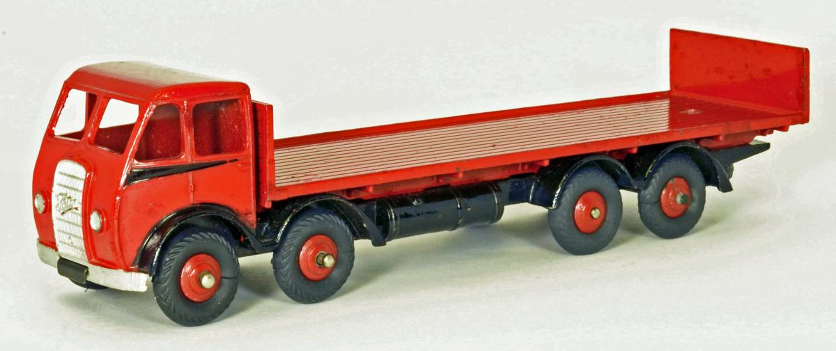 A fine new addition for the eight-wheeler fleet came in today: a first type Foden Flat Truck with Tailboard, the later version with round treaded tyres, chassis slot holes for the end-1948 tanker variant, towing hook, later blue/orange colour finish and the later faint blue box with black/orange printed label. Kind regards, Jan